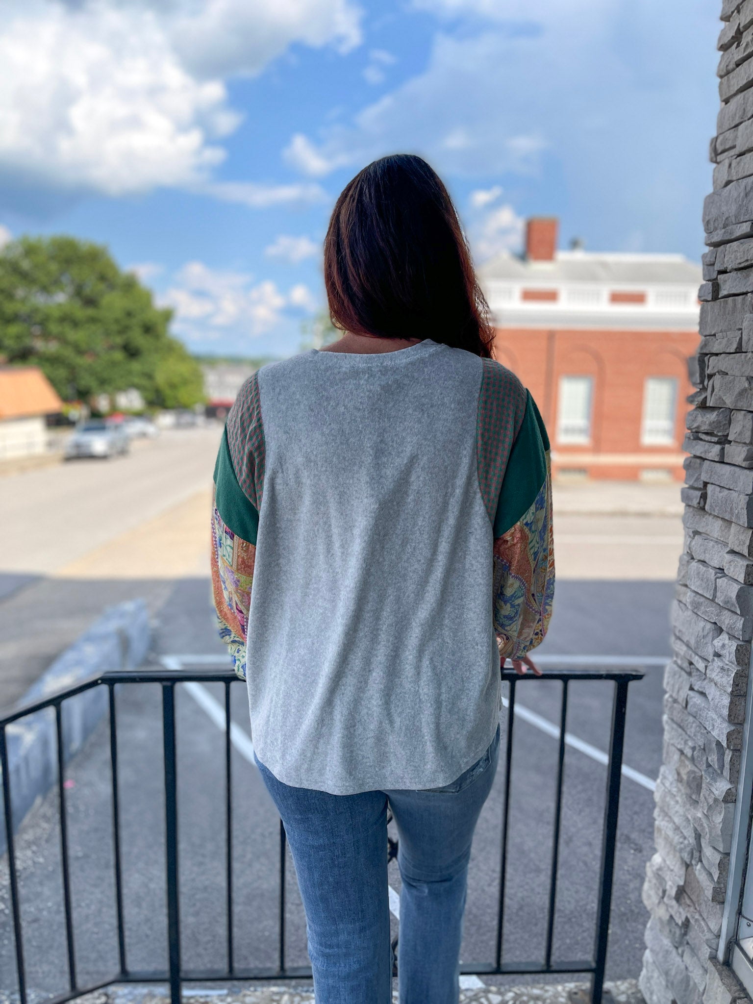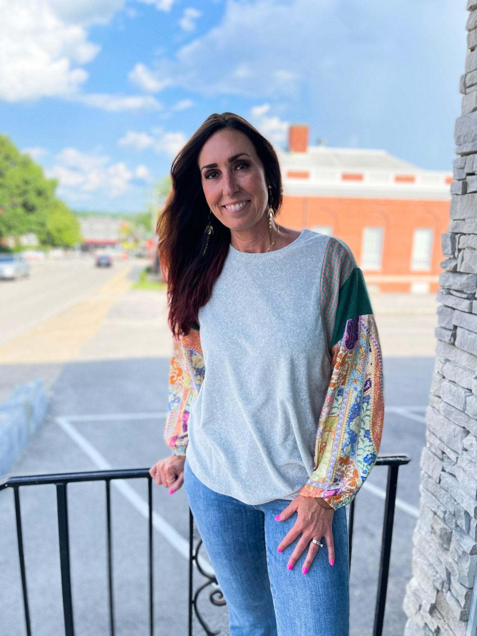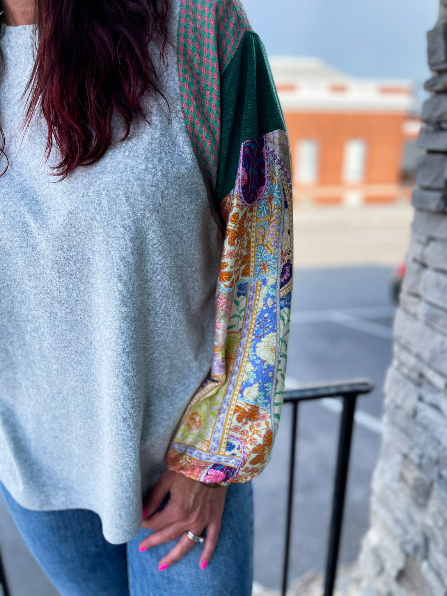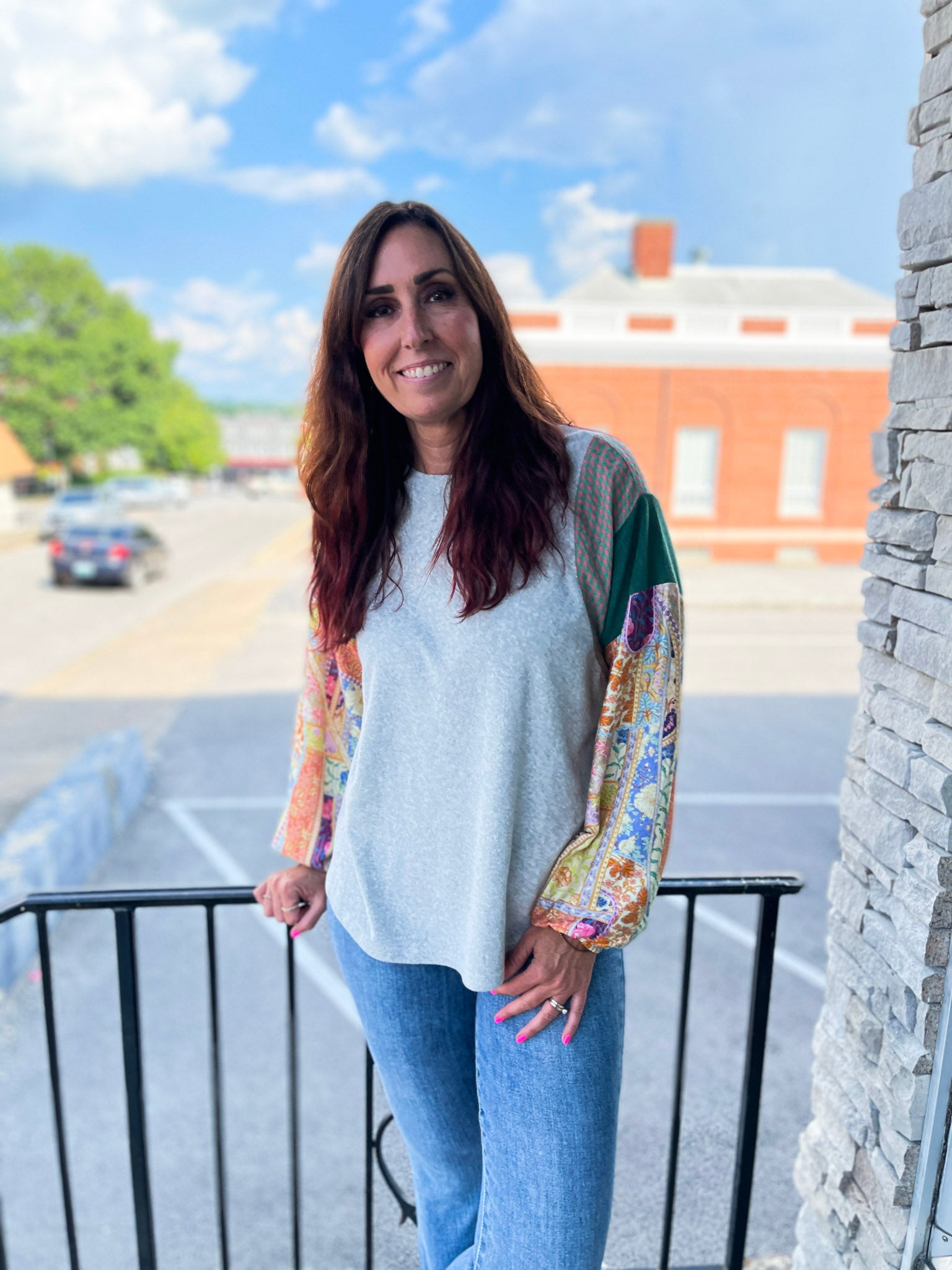 Bright, breezy, and made for days that call for a little color—this relaxed knit top features a soft heathered body, round neckline, and billowy patchwork sleeves in a mix of vibrant prints. The drop-shoulder design and flowy fit make it perfect for easygoing early autumn style.
