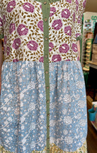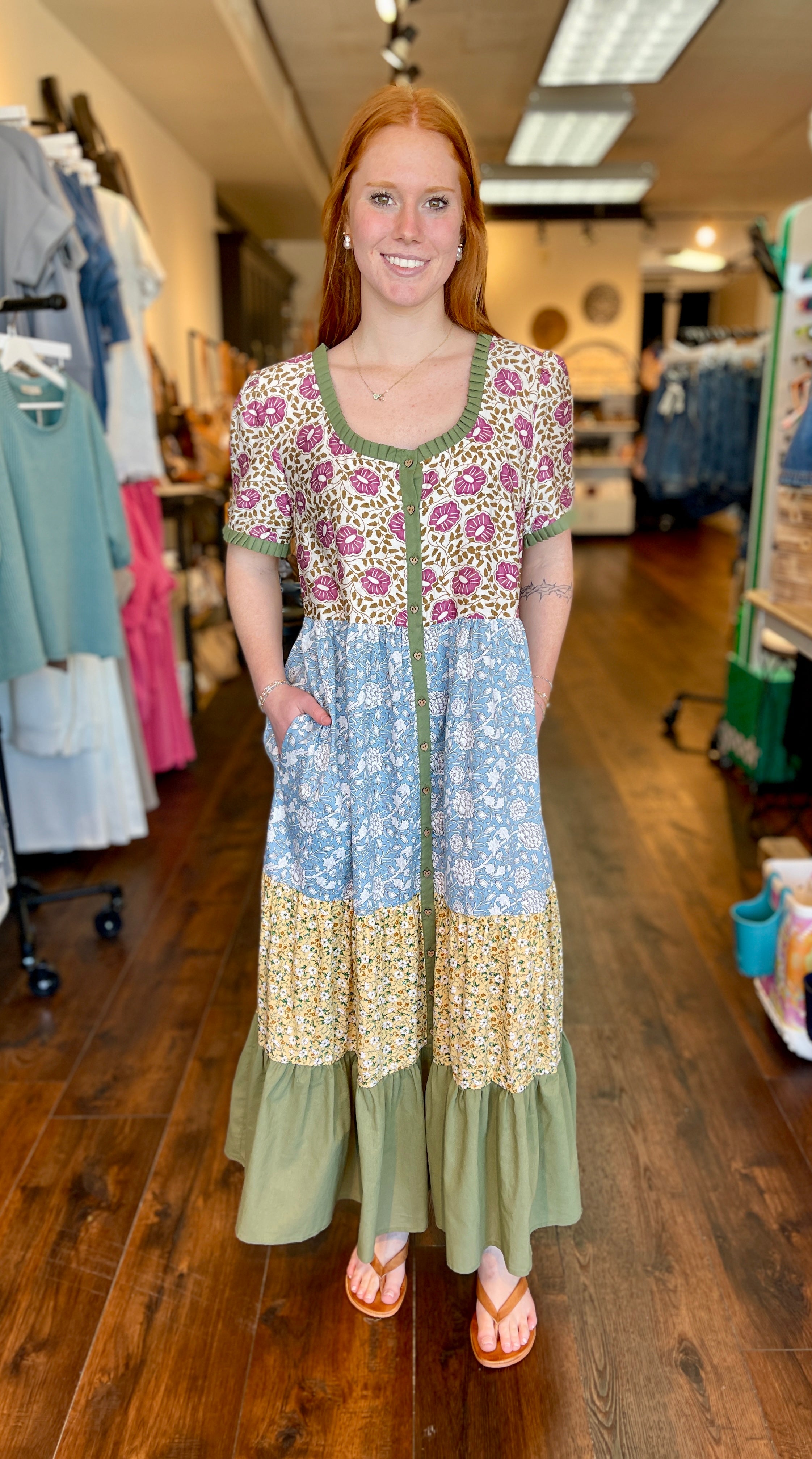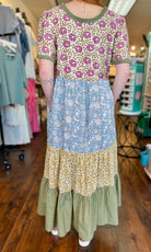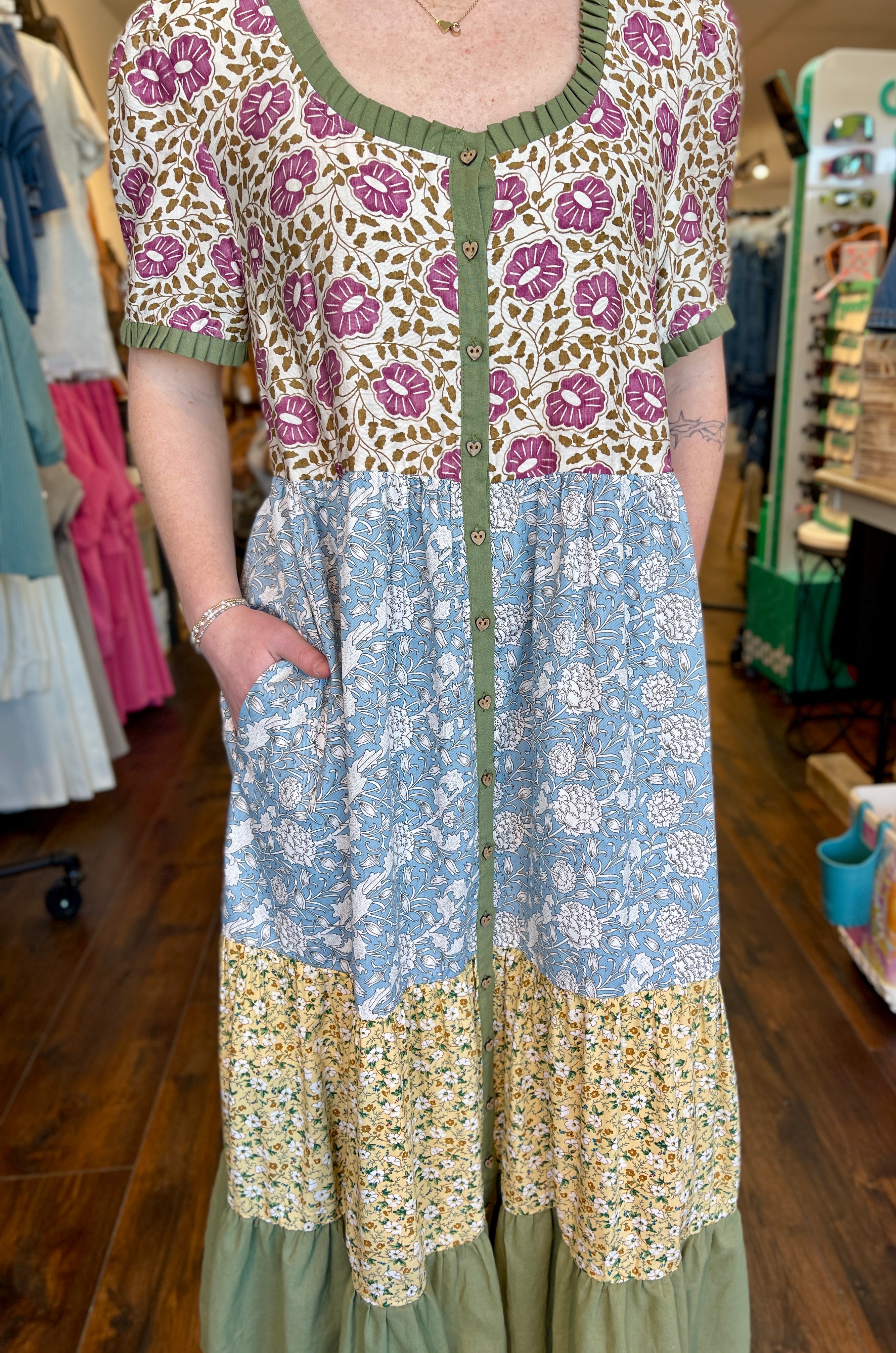 Twirl in this charming tiered maxi dress featuring a playful mix of floral prints. The flowing silhouette, square scoop neckline, empire waistline, and convenient side pockets make it perfect for effortless style. Zoom in on those adorable wooden heart buttons! This dress has all the right details on this one.