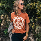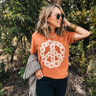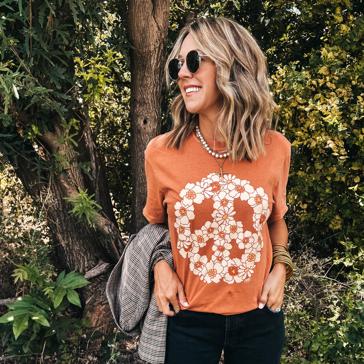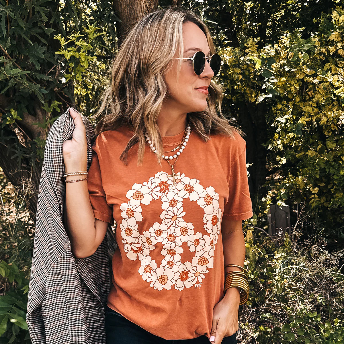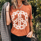 Get ready to spread good vibes with our Peace Flower Tee! Designed in cozy yam color comfort colors, this tee features a floral peace sign for a touch of boho style.