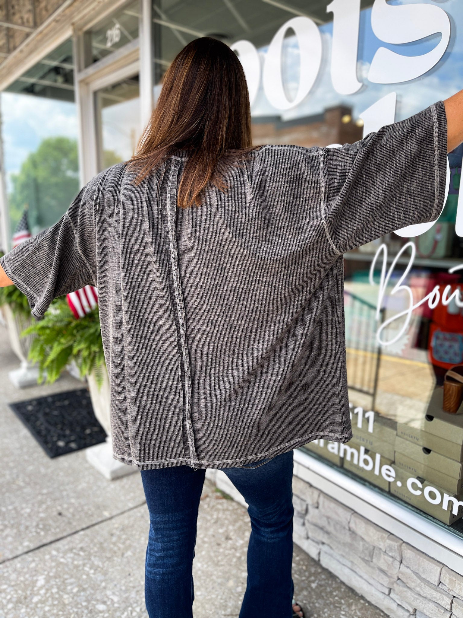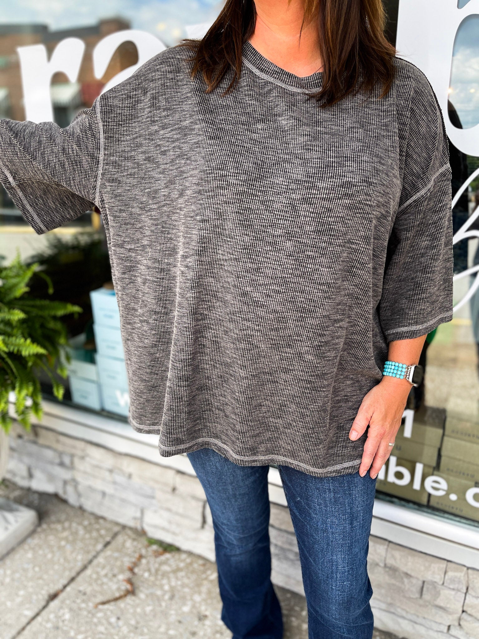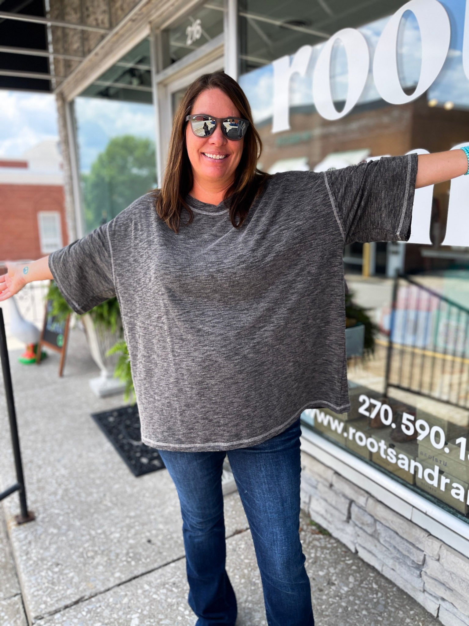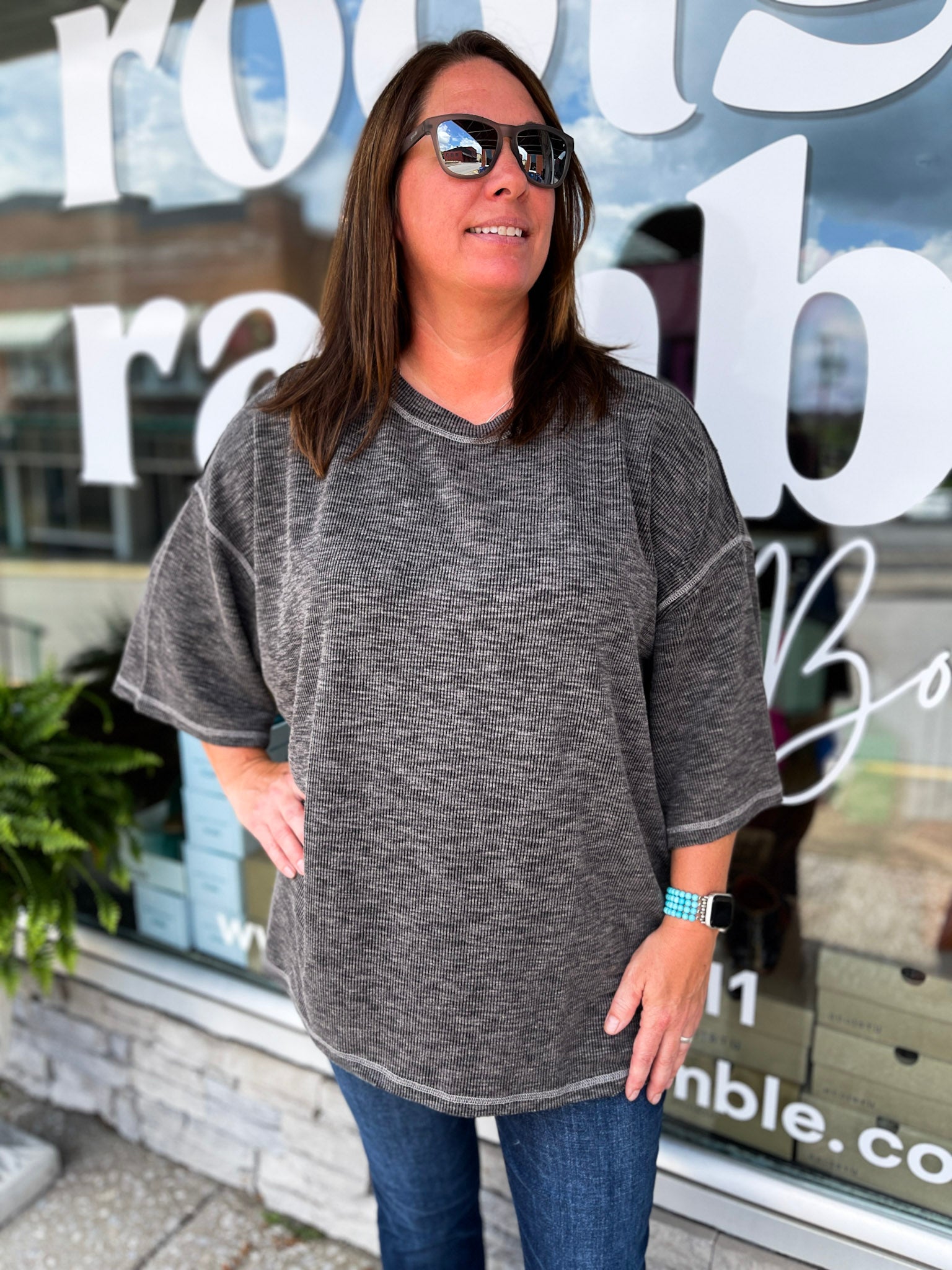 Comfy, oversized, and made for layering. This ribbed top features a round neck, short sleeves, and raw stitch details—perfect with leggings and a denim jacket for those crisp fall days.