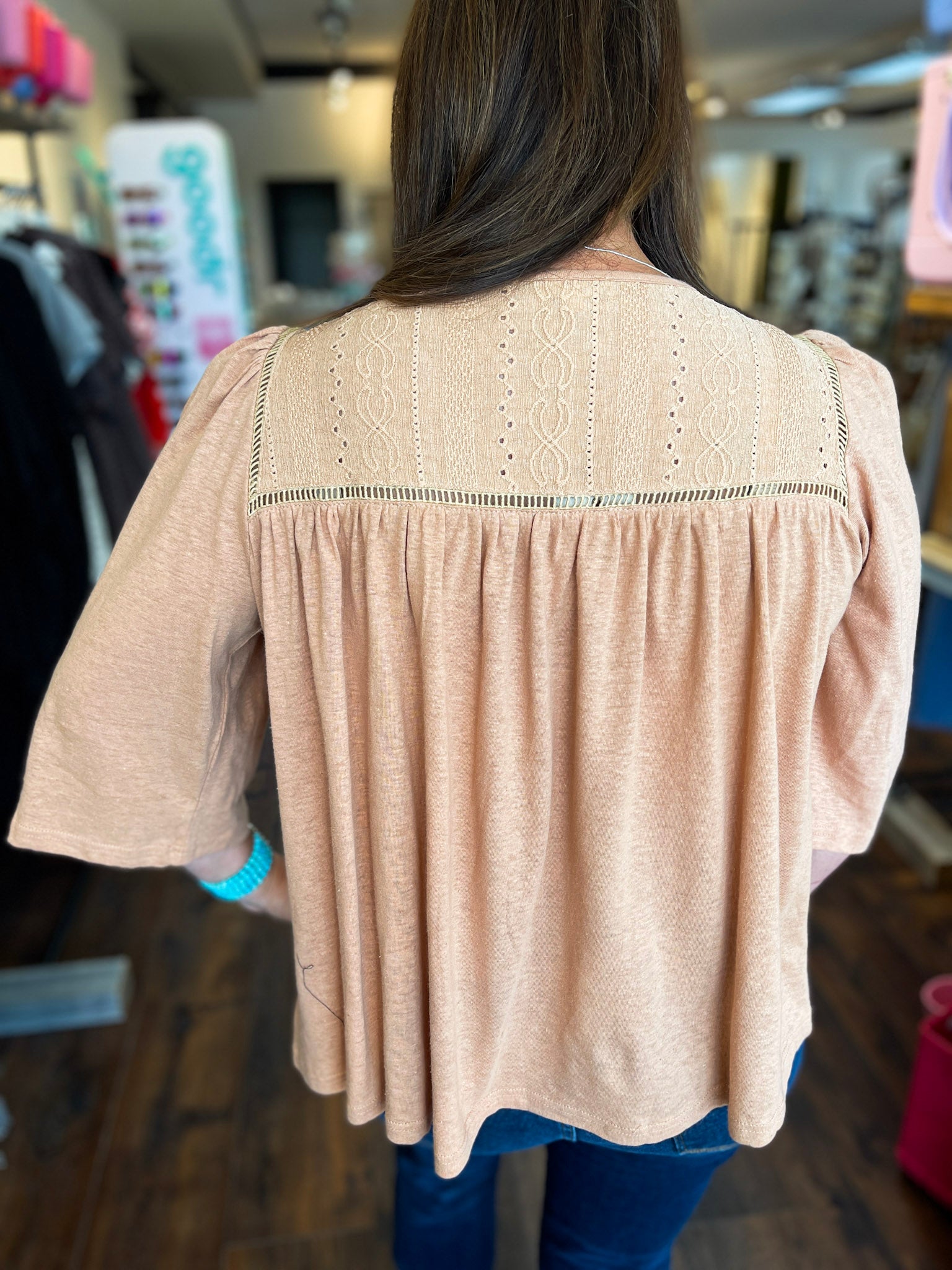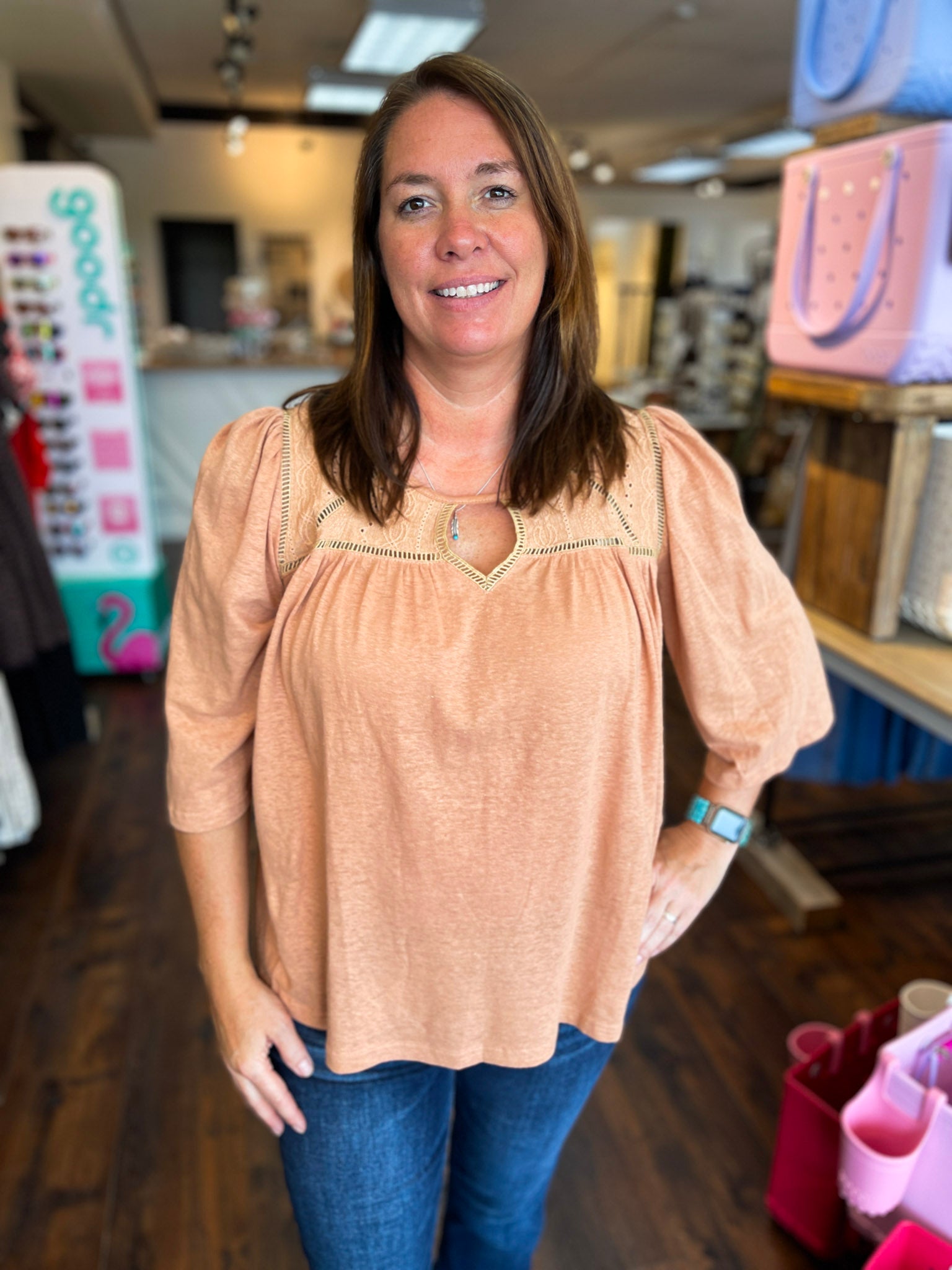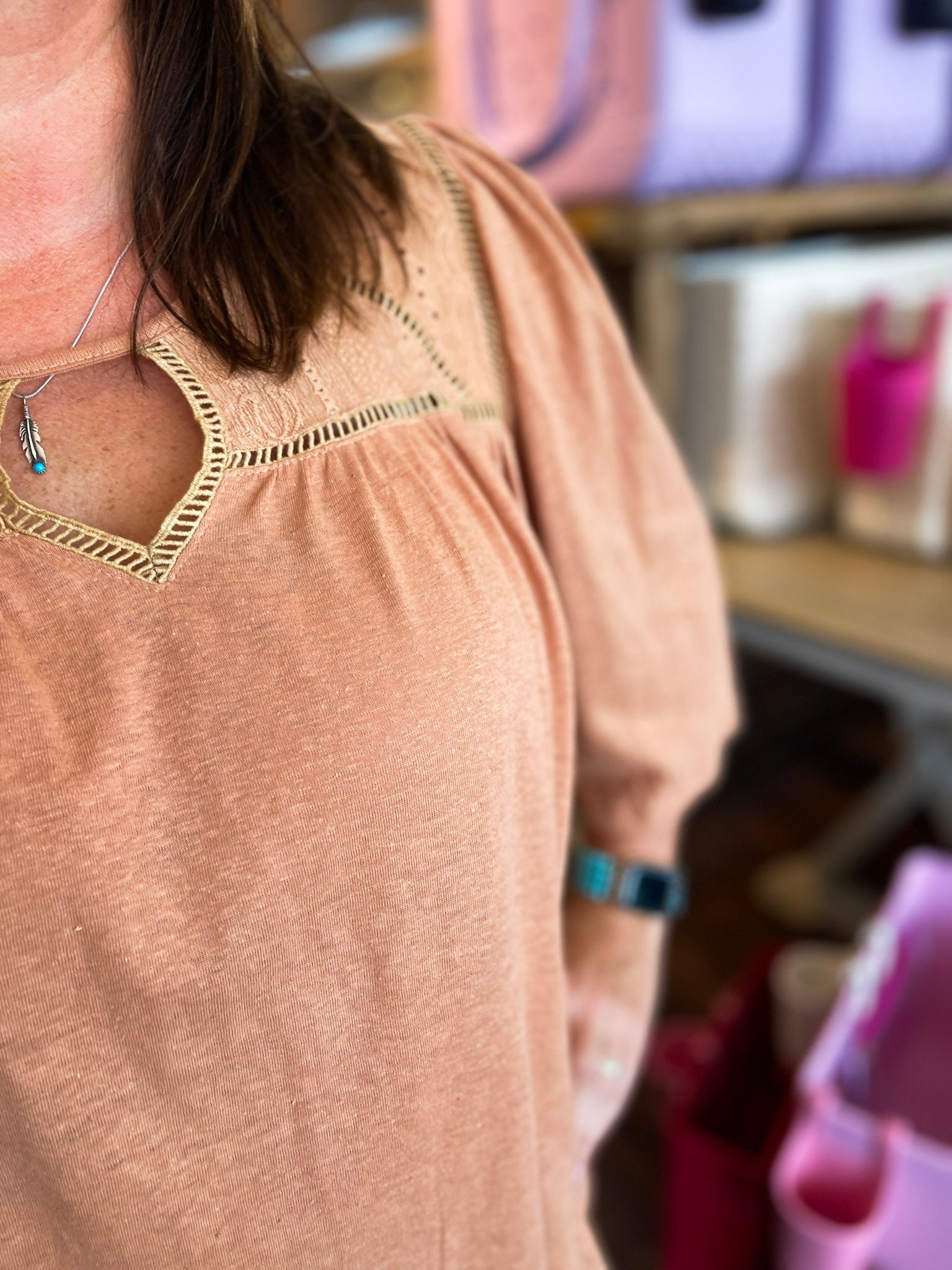 A relaxed fit meets pretty details. Featuring soft rayon fabric, eyelet lace accents, and a keyhole neckline—this top is the perfect fall transitional piece to add to your wardrobe!