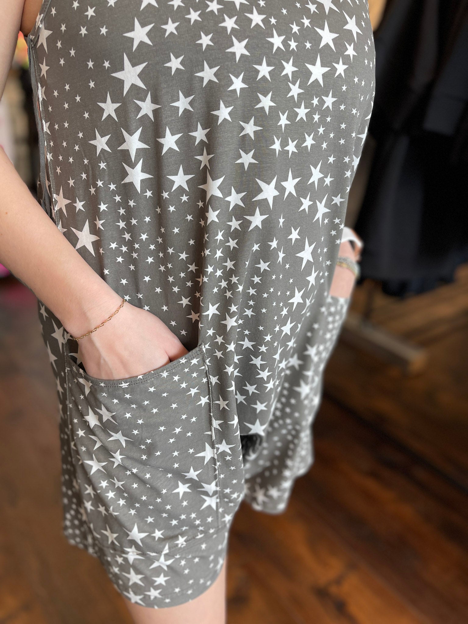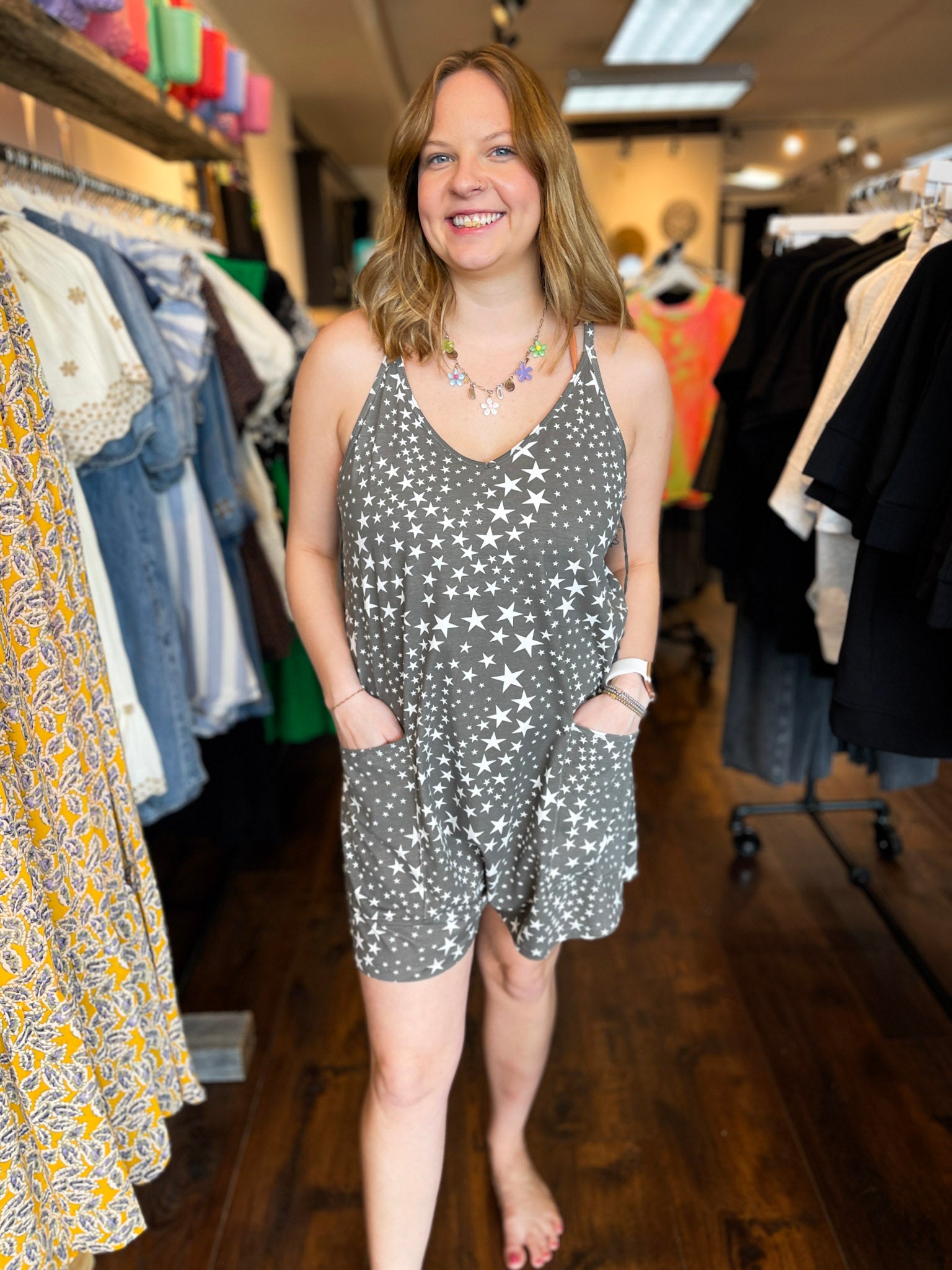 This comfy star print romper gives us all the summer vibes! Adjustable straps and functional pockets make it perfect for all day wear and the soft  cotton material is bound to keep you cool on the hottest day!