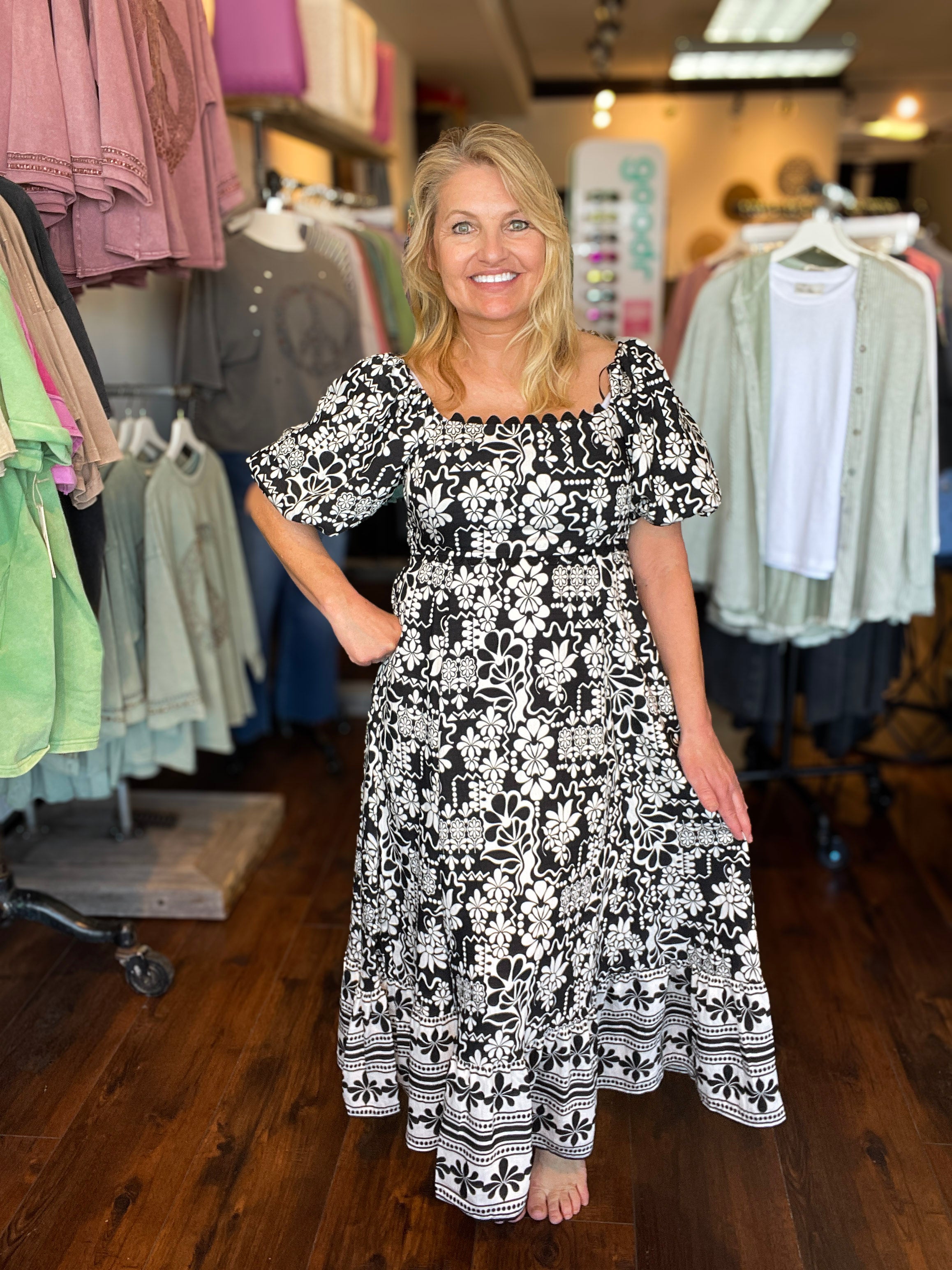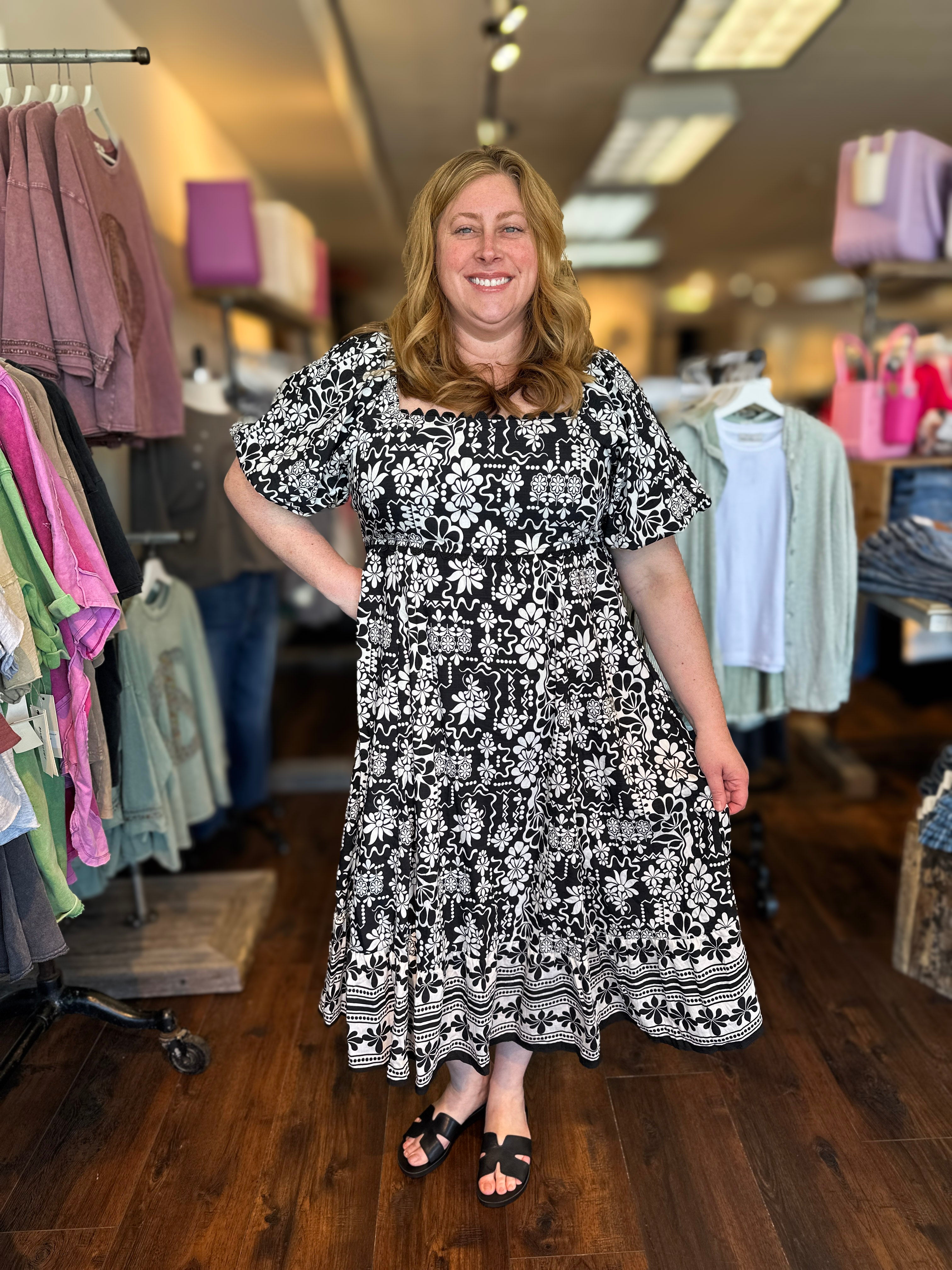 This midi dress is so beautiful featuring a fun abstract border print with a lined bodice and sleeves that can be worn on or off the shoulder. Pair with heels, sandals or wedges for a completed look for any occasion!Ā