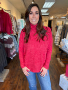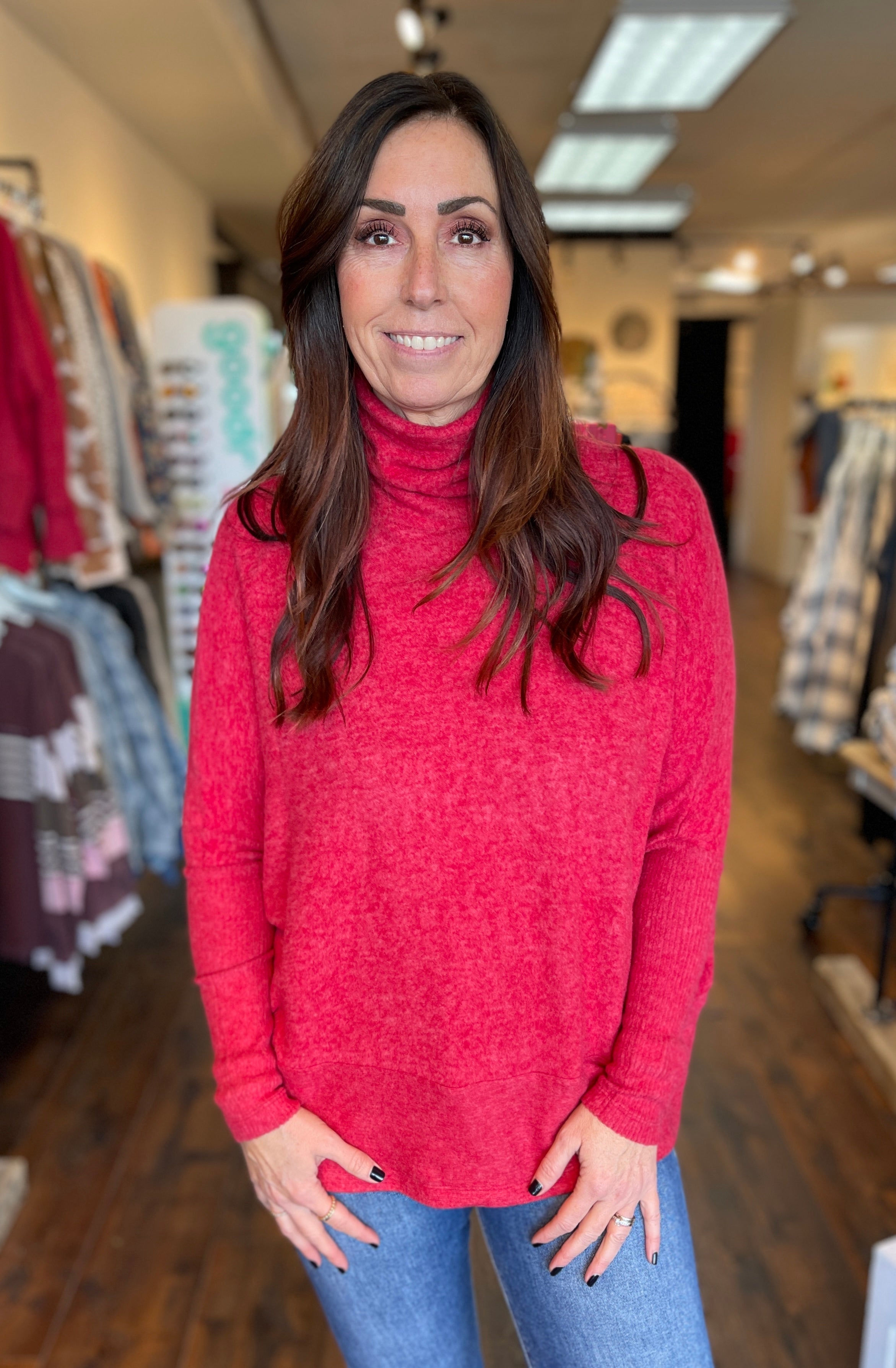 This turtleneck sweater is one of our BEST SELLERS! The heather red fabric is dreamy soft and it's perfect with jeans or leggings! It's really a lightweight sweater so you won't smother in this if you normally get hot. You will want to cuddle up and never take this one off!