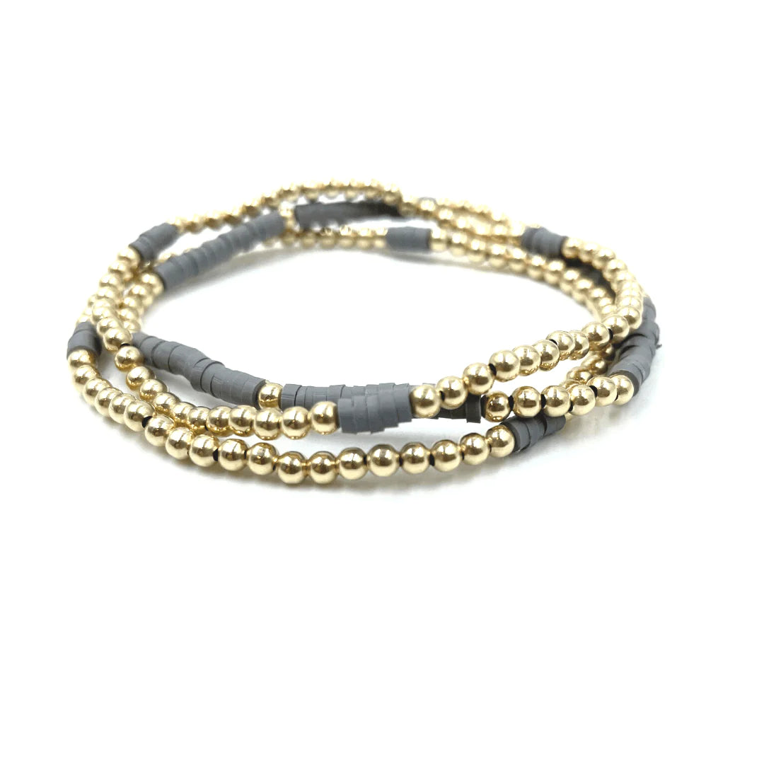 Our Coastal Collection bracelets! Perfect for the beach and water-resistant. These bracelets feature soothing colors that instill a sense of tranquility. Treat yourself to the ultimate stack, handcrafted with 14k gold filled beads and soft, recycled light gray disc beads. Each bracelet stretches up to 7 inches and comes in a set of three.