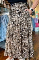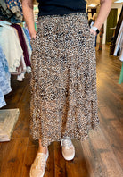 This leopard print tiered skirt features a high-waisted design with an elastic waistband. Made from lightweight fabric, it has ruffled tiers and an asymmetrical hem, offering a stylish and dynamic look.