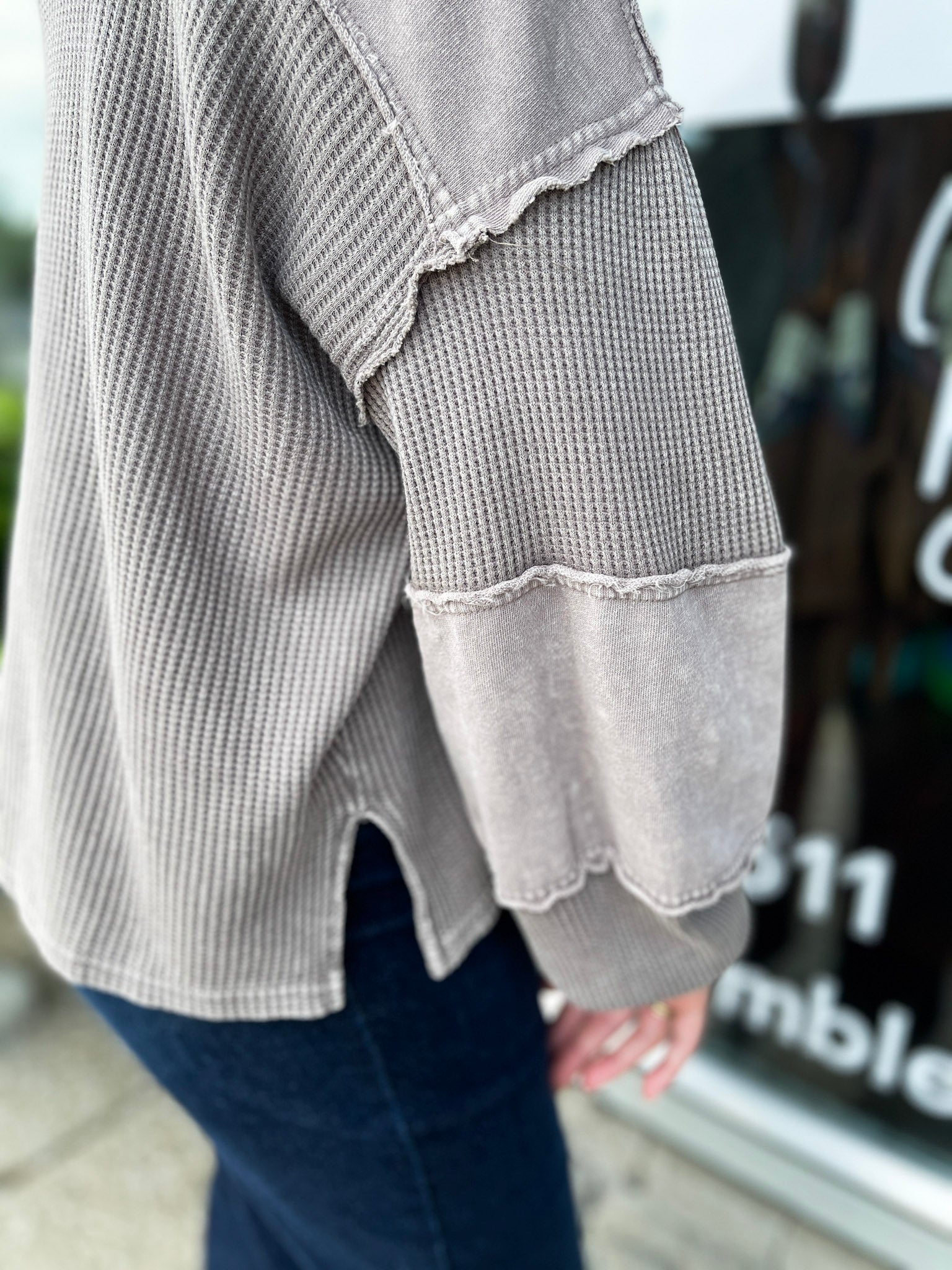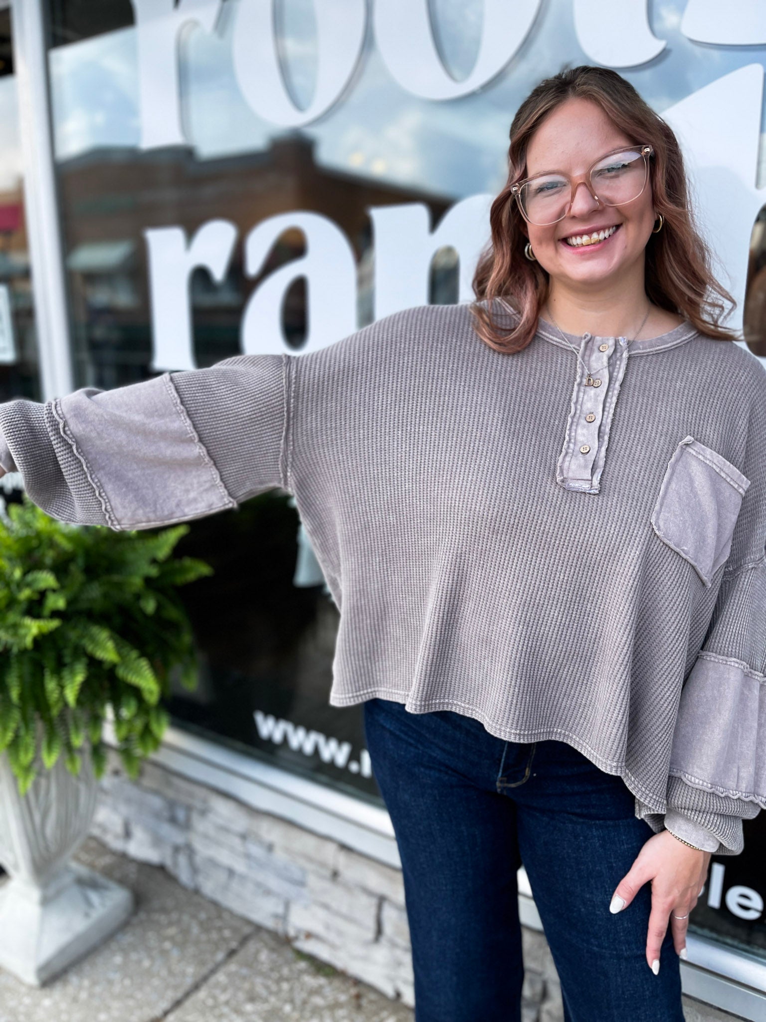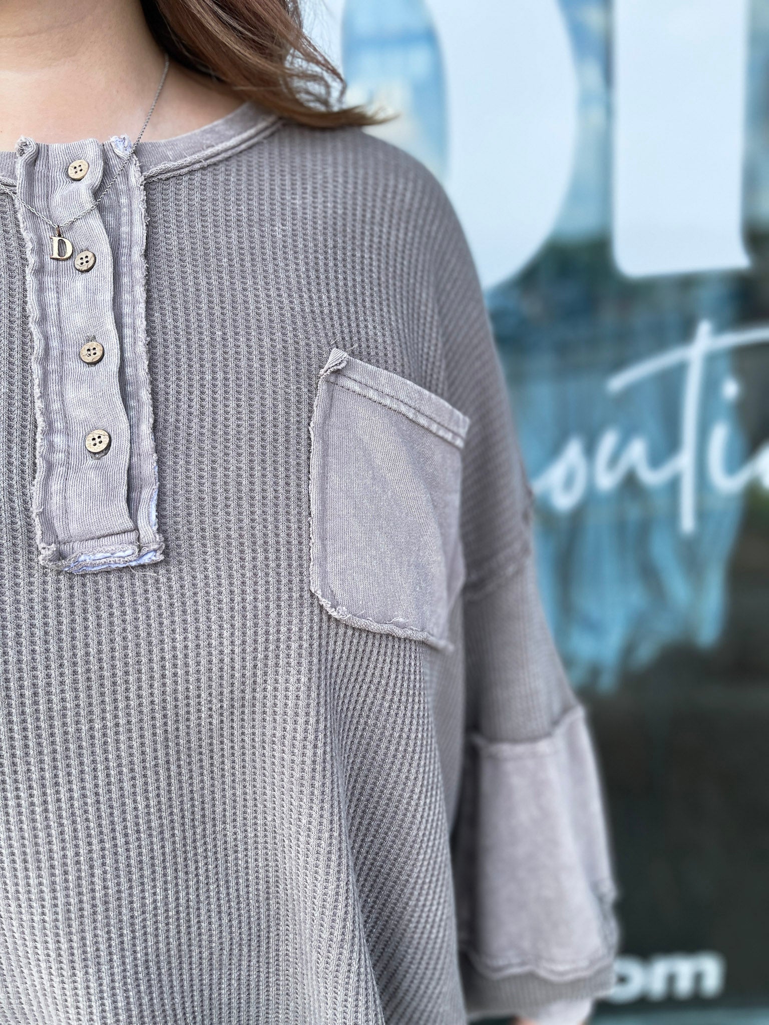 Is this not the cutest thermal top you've ever seen?? Mineral wash finish, Button detailing, front pocket and bubble sleeves! So cute paired with your favorite denim!
