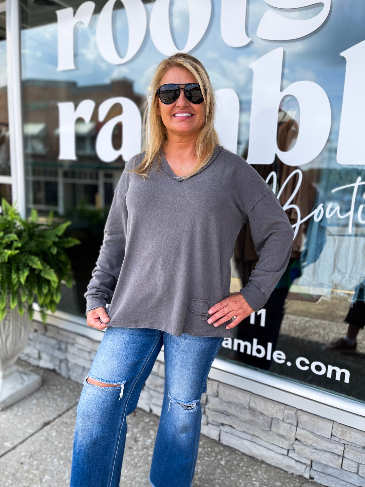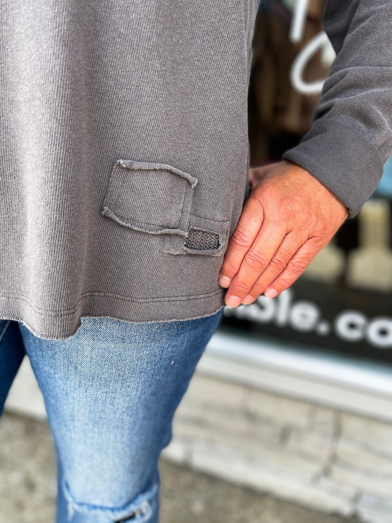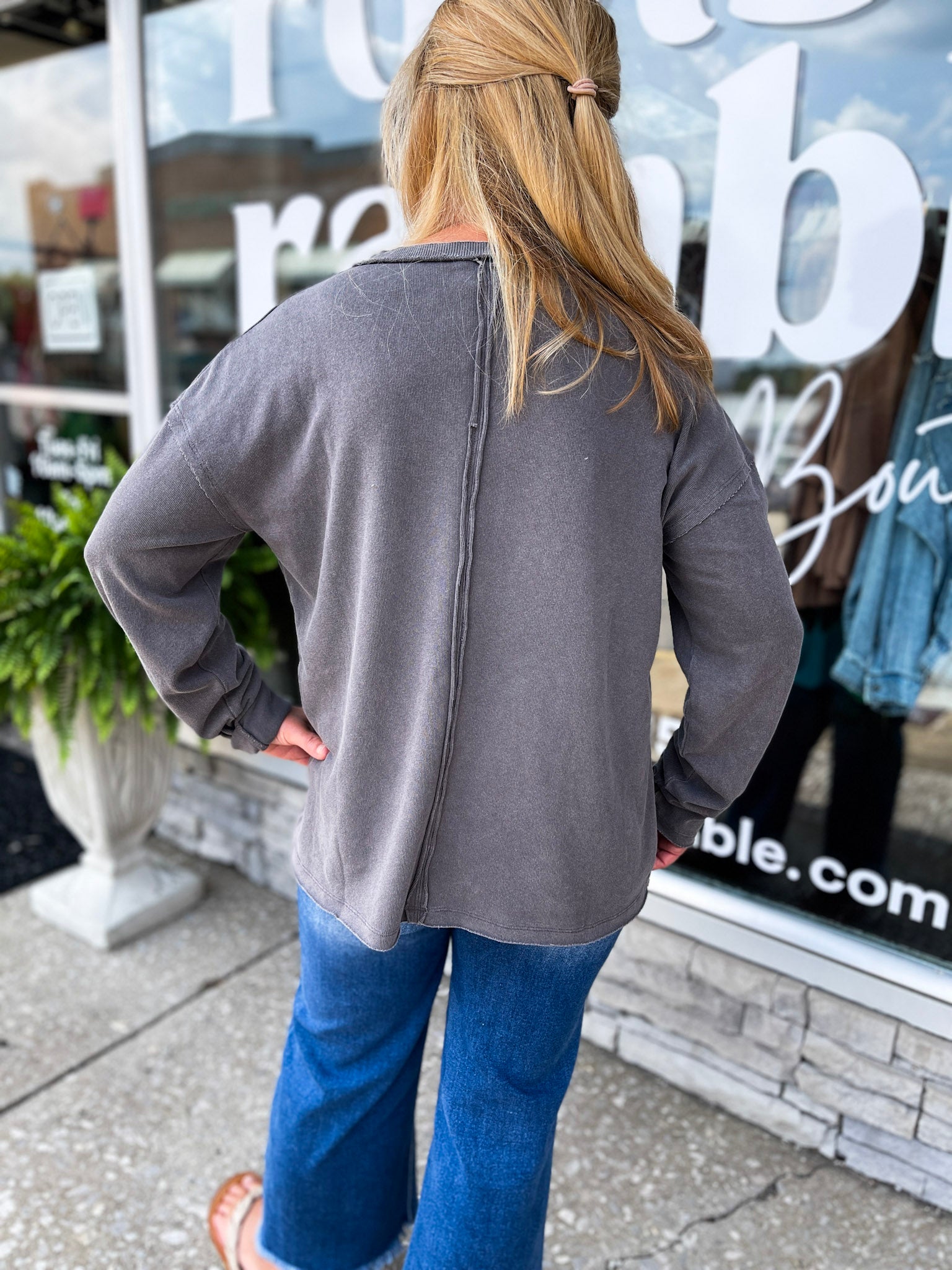 Laid-back and lived-in 💠This mineral washed charcoal long sleeve tee features a relaxed fit, raw edge v-neckline, and a tiny front patch for a touch of detail. Soft, easy, and made for everyday wear—just throw it on with your favorite jeans and go.
