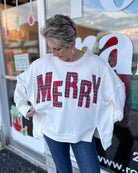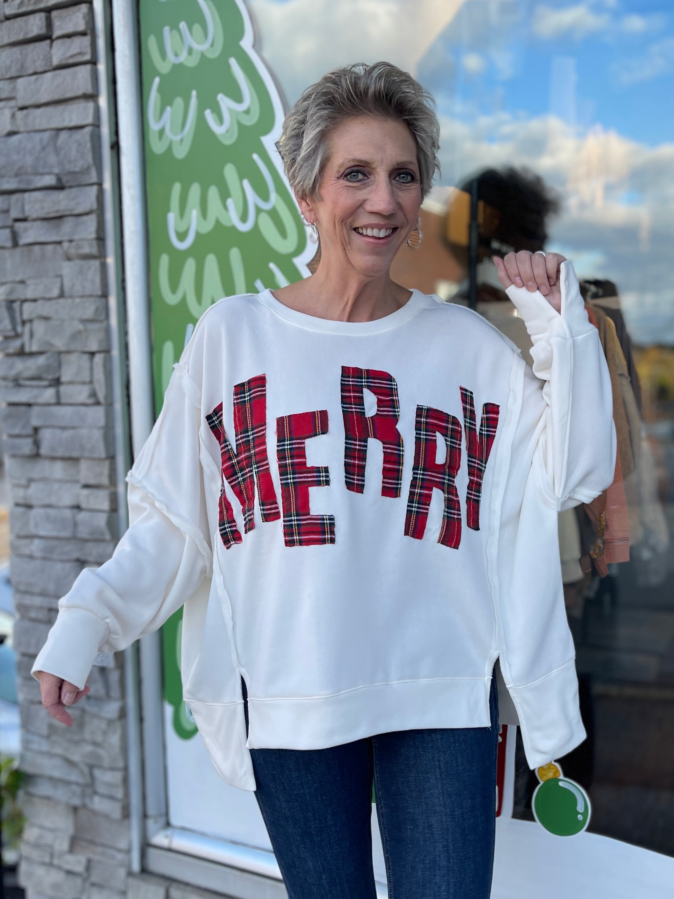 Cozy oversized fleece with Christmas plaid letters in "MERRY" with a cut edge details.