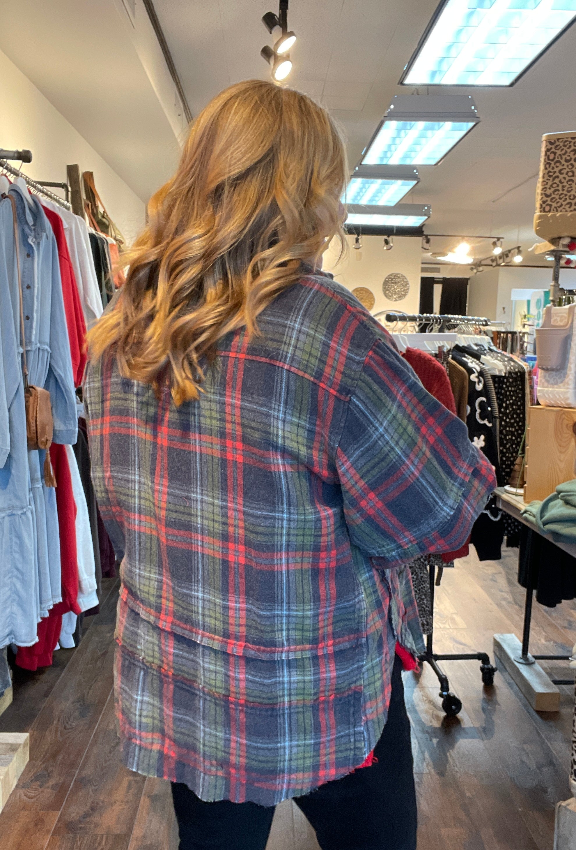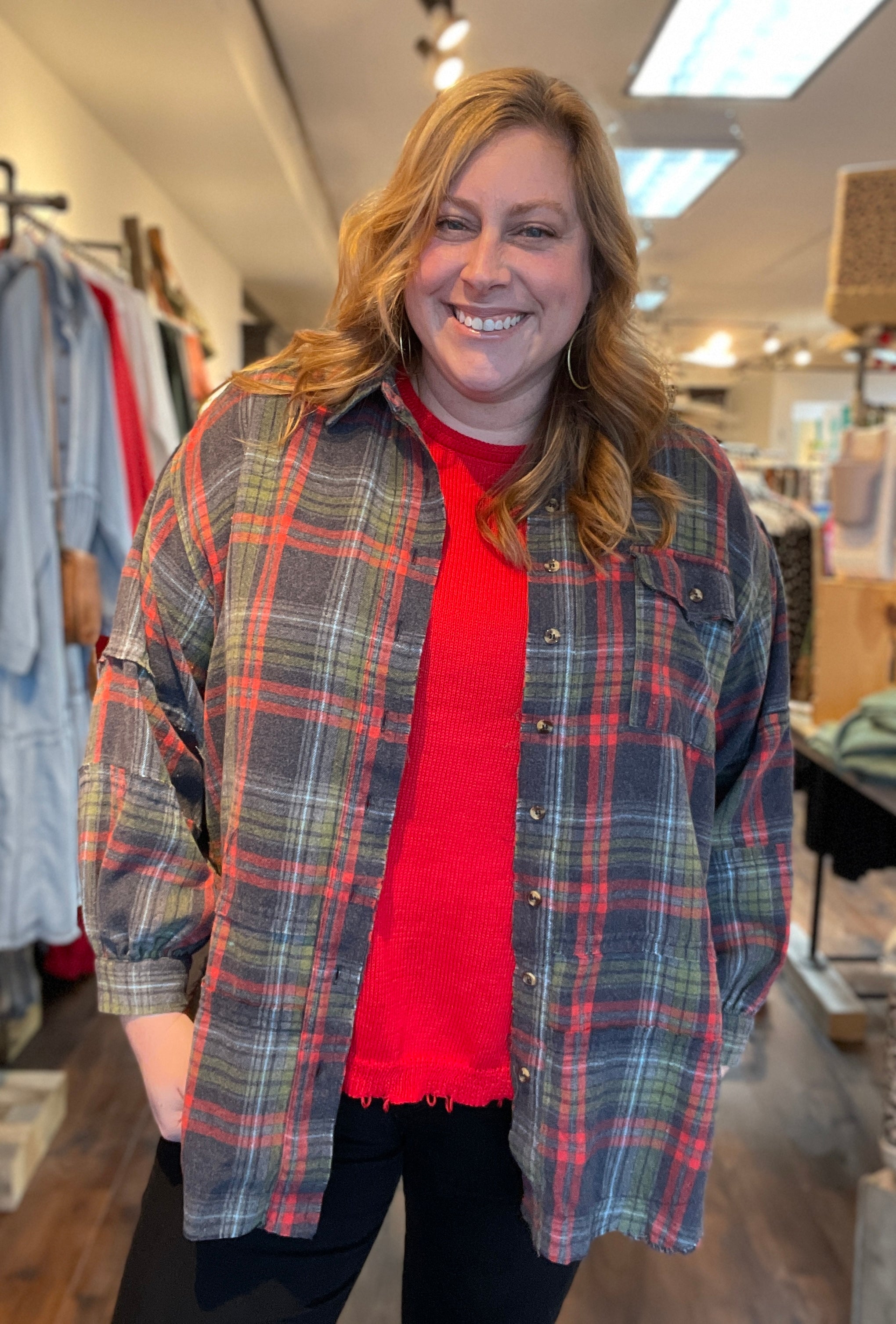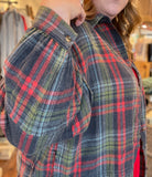 WASHED PLAID SHIRT TUNIC-MINERAL WASHED-BUTTON DOWN FRONT-FLANNEL SHIRT-OVERSIZED, RELAXED SILHOUETTE-COLLARED NECKLINE-CHEST POCKETS-RAW EDGE, CURVED HEMLINE