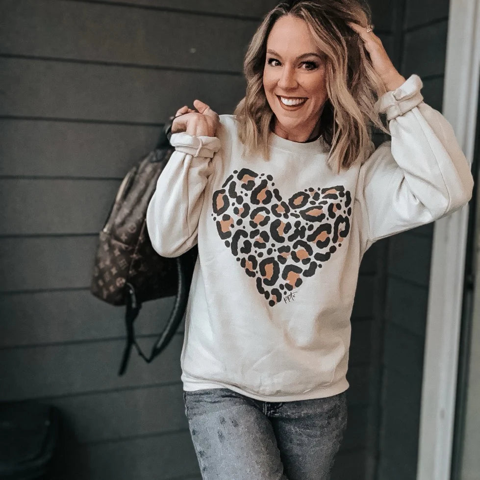Get ready to fall in love with the Leopard Heart Sweatshirt! This sandy-colored sweatshirt features a playful heart design, perfect for Valentine's Day (and any day, really). Its versatile neutral shade makes it a wardrobe must-have.