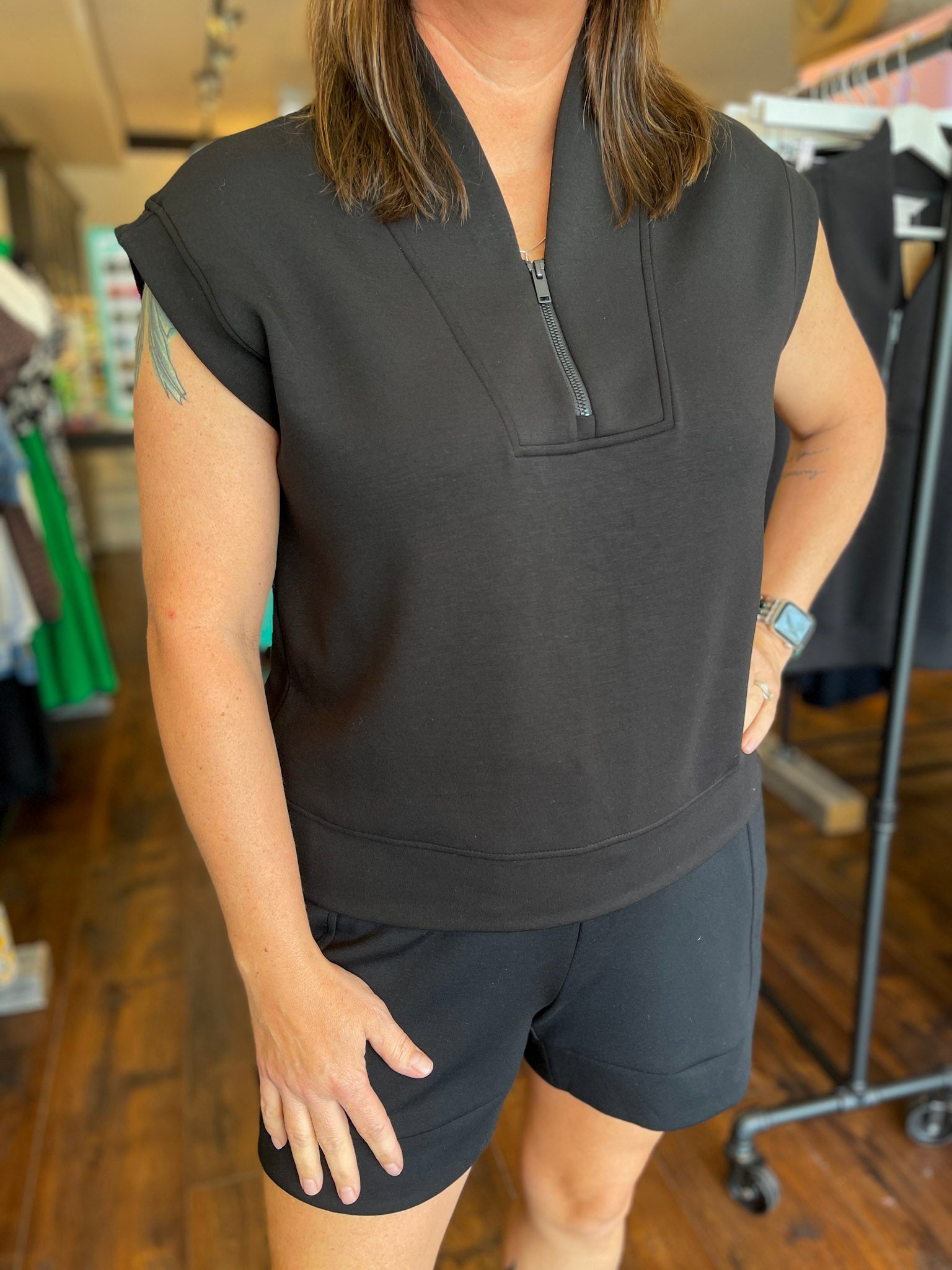 A sleeveless top crafted from luxurious, silky smooth fabric with paneled v-neck and quarter zip closure. Effortlessly chic and ultra-soft, it brings comfort to everyday wear.