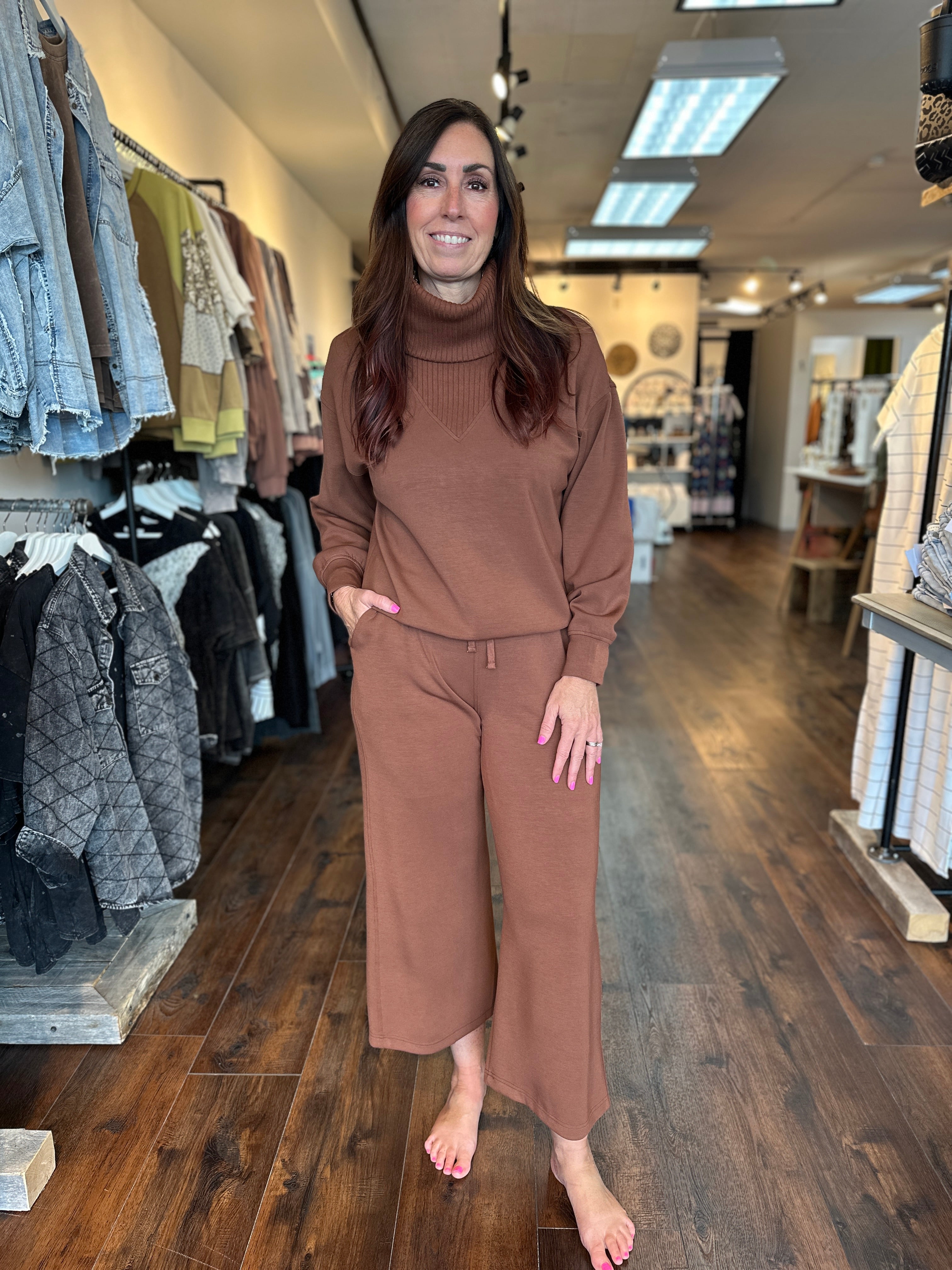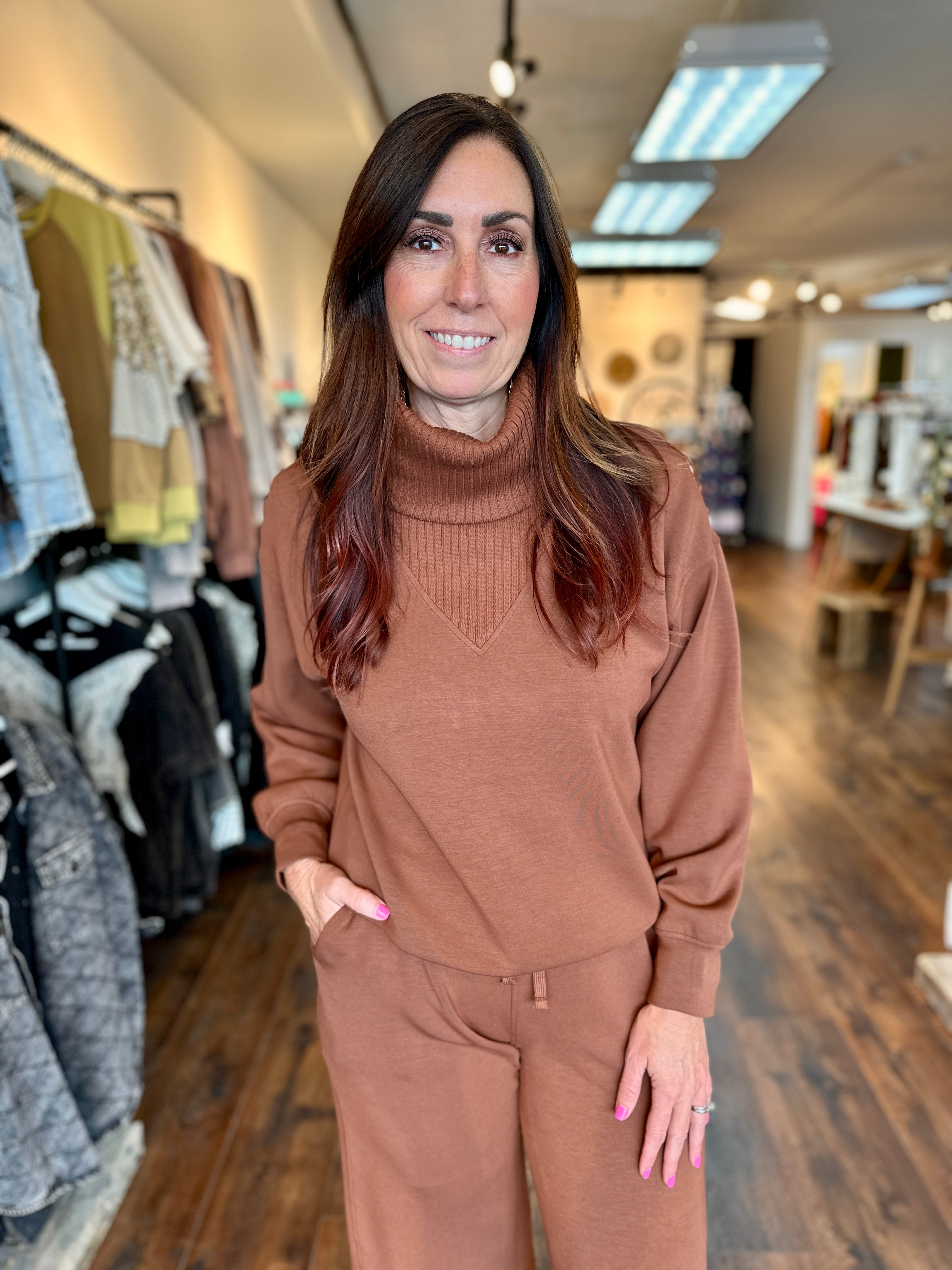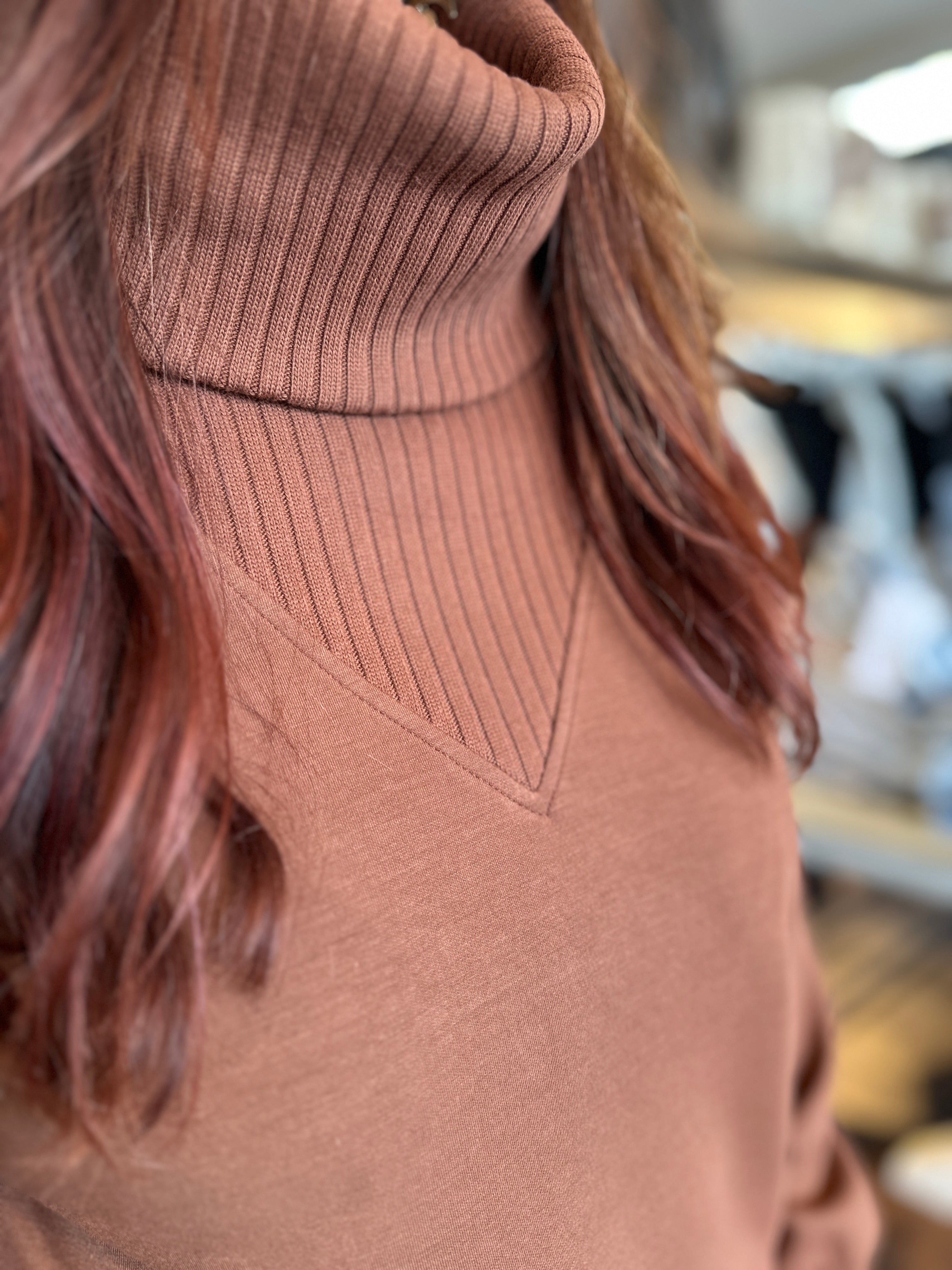 This top features a standout V-neck turtleneck design with a contrasting 4x2 rib detail. Match with Rambler pants or denim or black pants. So versatile!