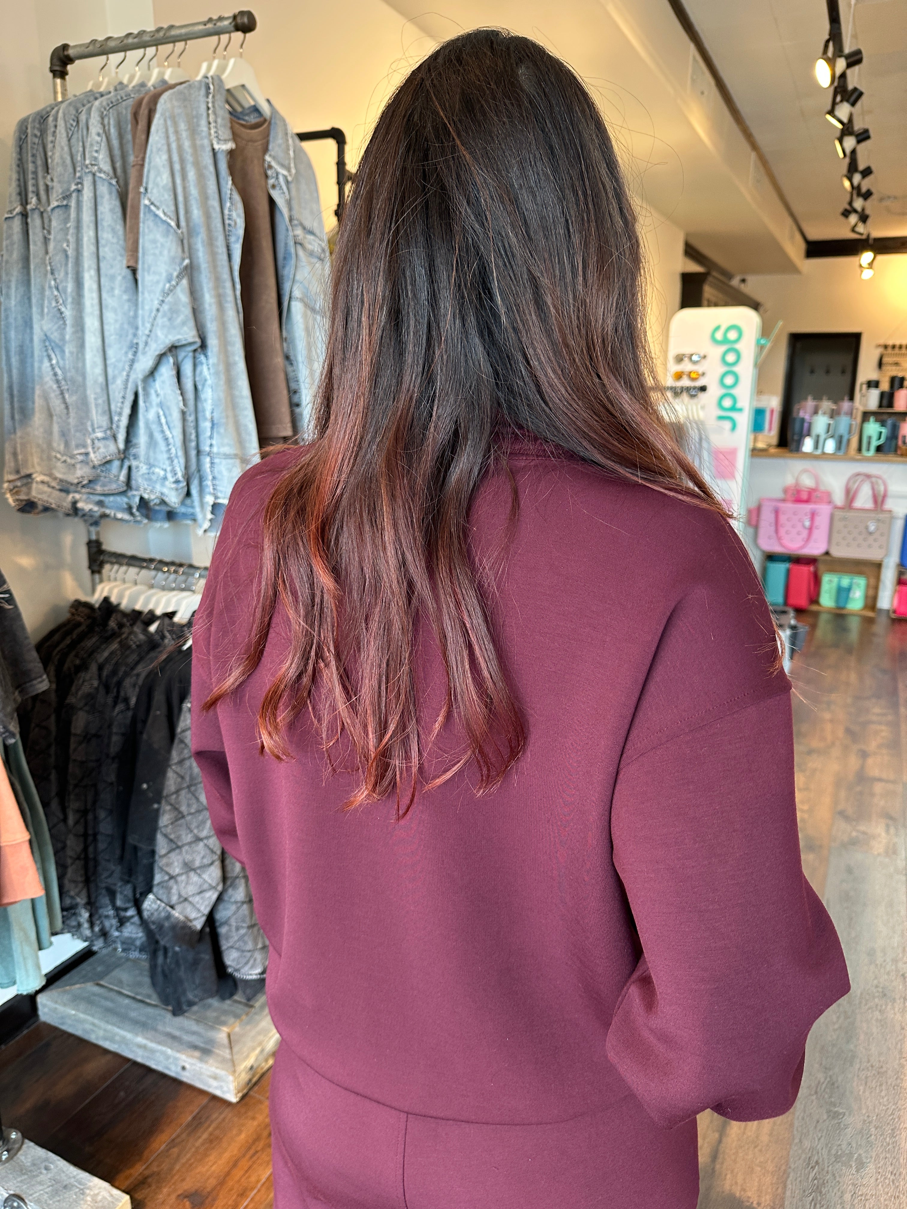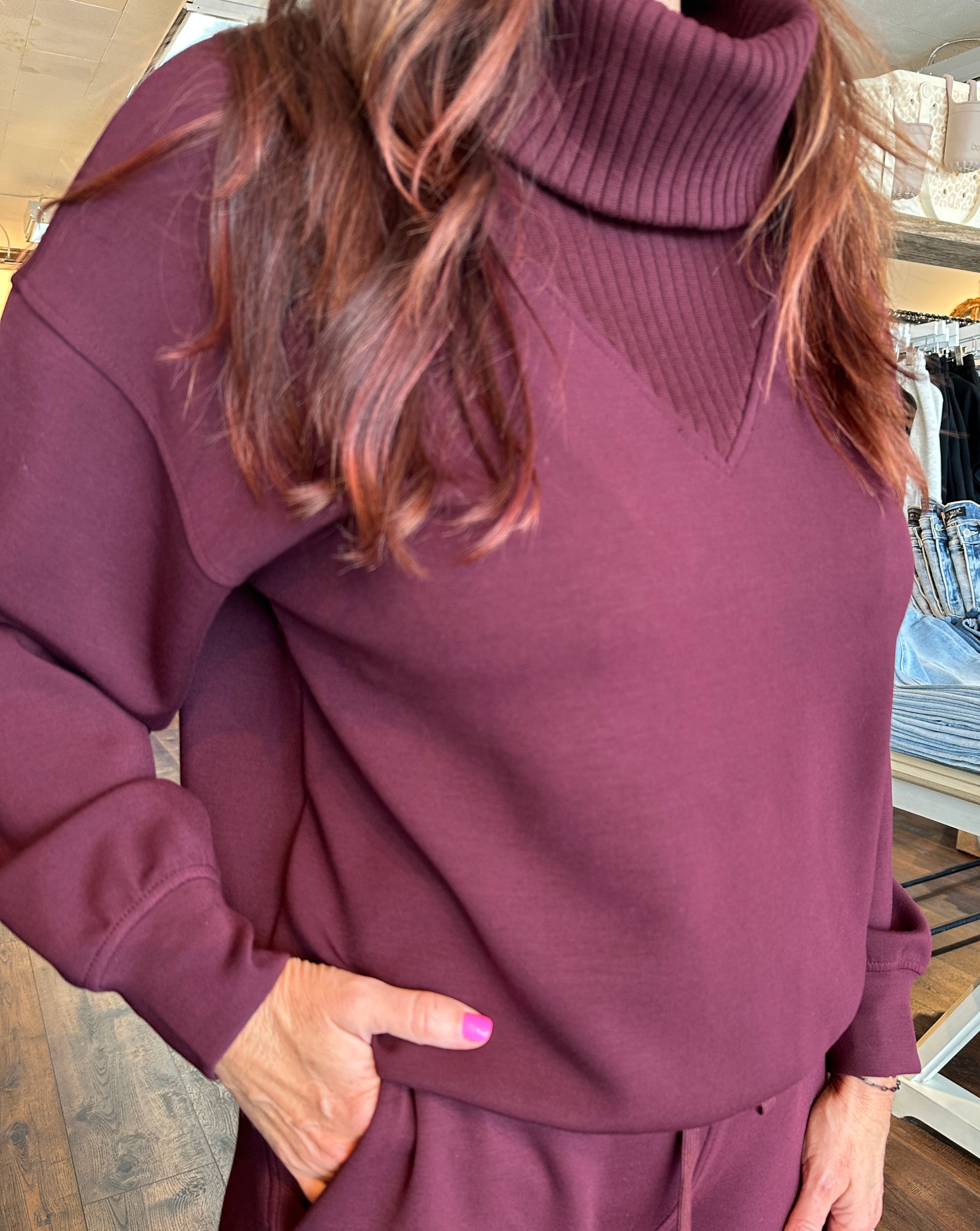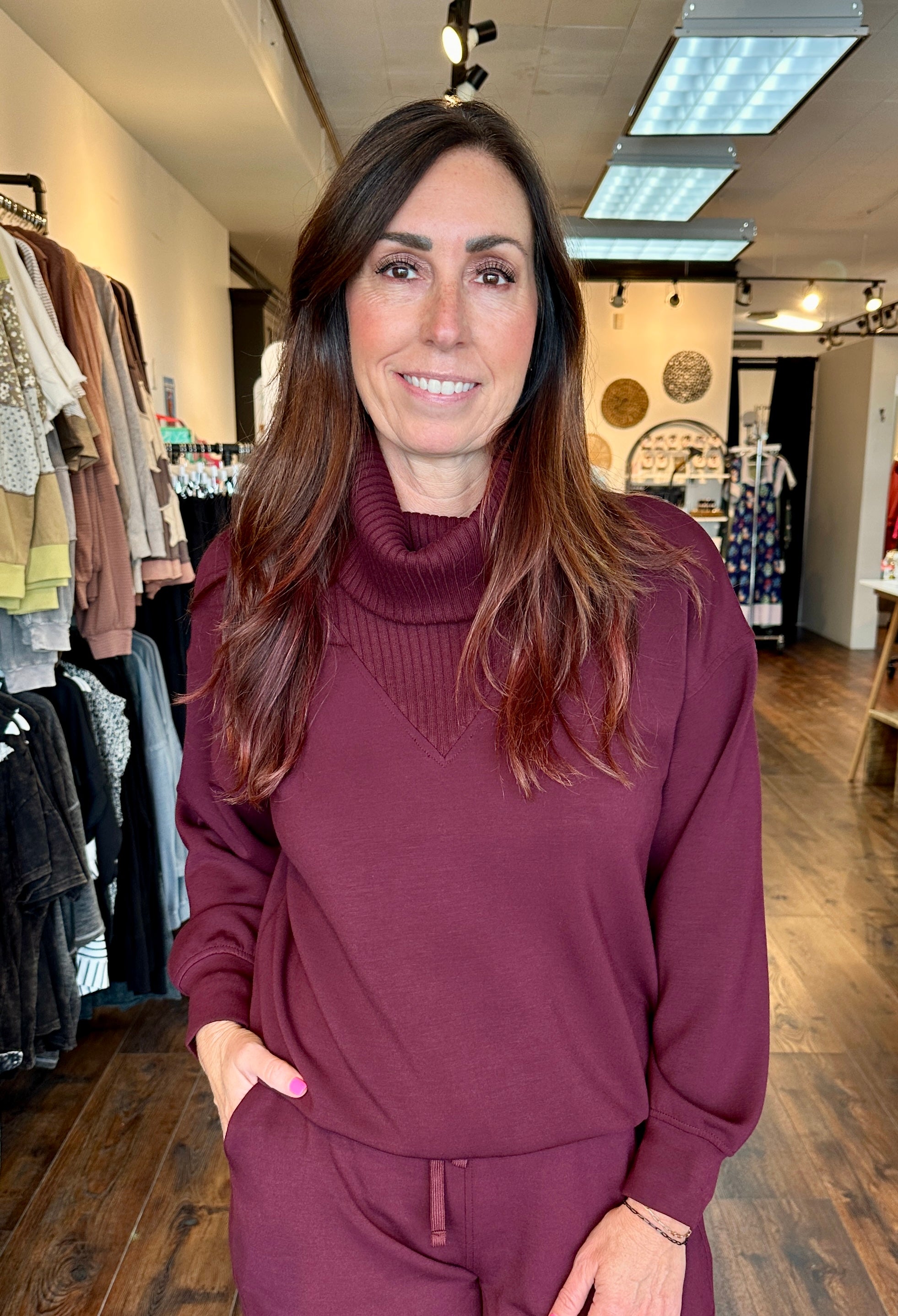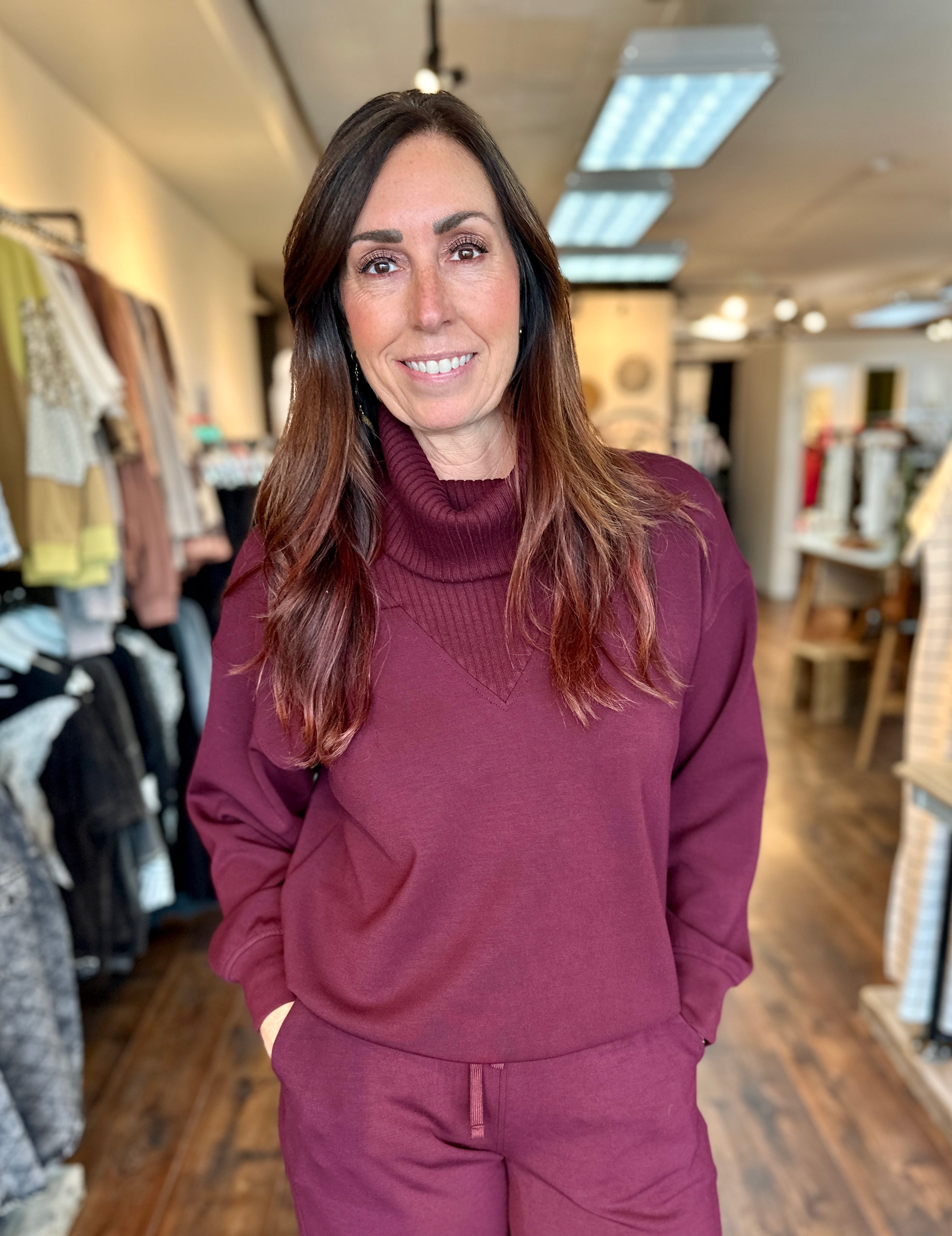 This top features a standout V-neck turtleneck design with a contrasting 4x2 rib detail. Match with Rambler pants or denim or black pants. So versatile!