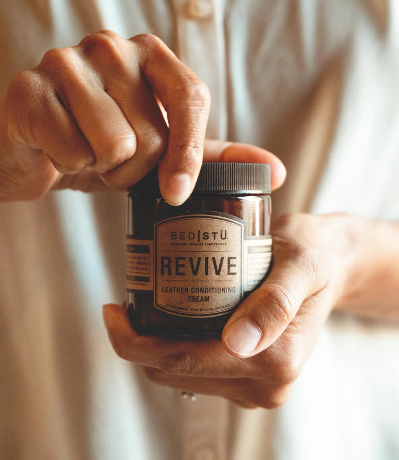 Treat your high quality leather goods to a little TLC. We’ve created a special formula to clean, condition, and extend the natural life and beauty of your BED|STÜ products, while preserving their uniqueness: REVIVE. Formulated using only the highest quality natural ingredients, REVIVE will keep your BED|STÜ’s looking as good as new.