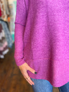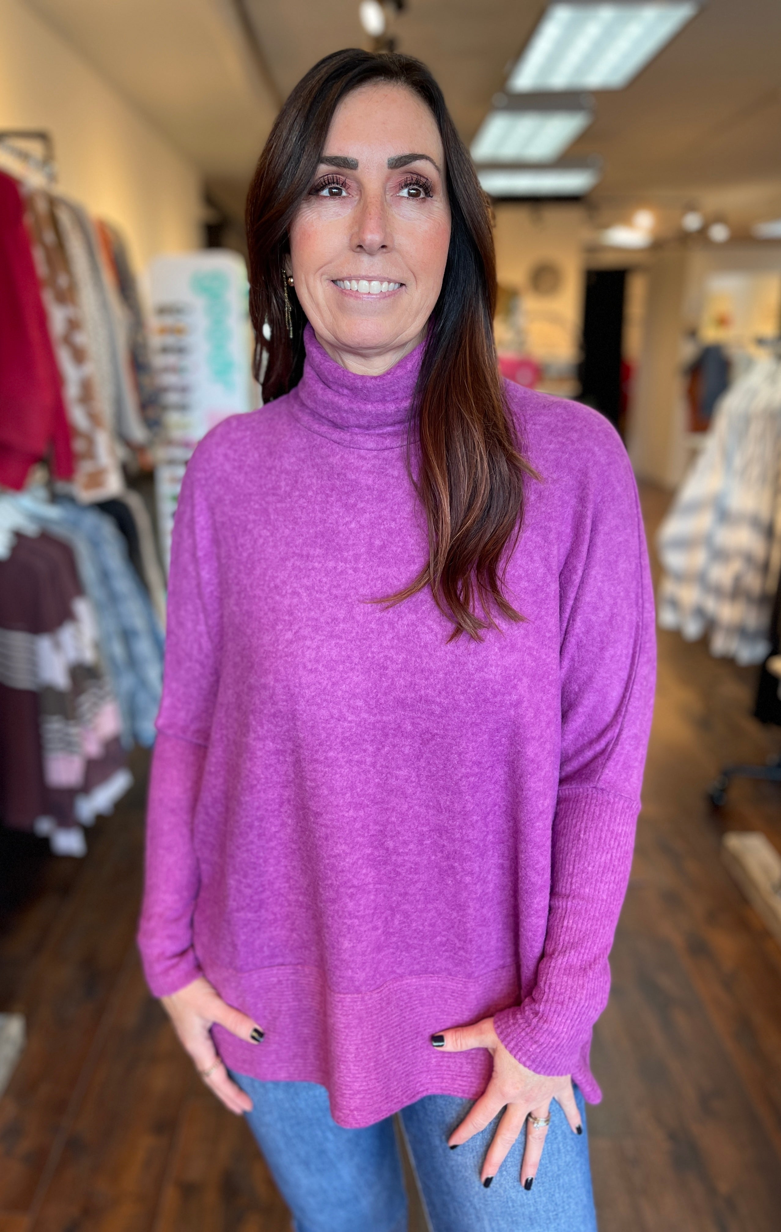 This turtleneck sweater is one of our BEST SELLERS! The heather orchid fabric is dreamy soft and it's perfect with jeans or leggings! It's really a lightweight sweater so you won't smother in this if you normally get hot. You will want to cuddle up and never take this one off!