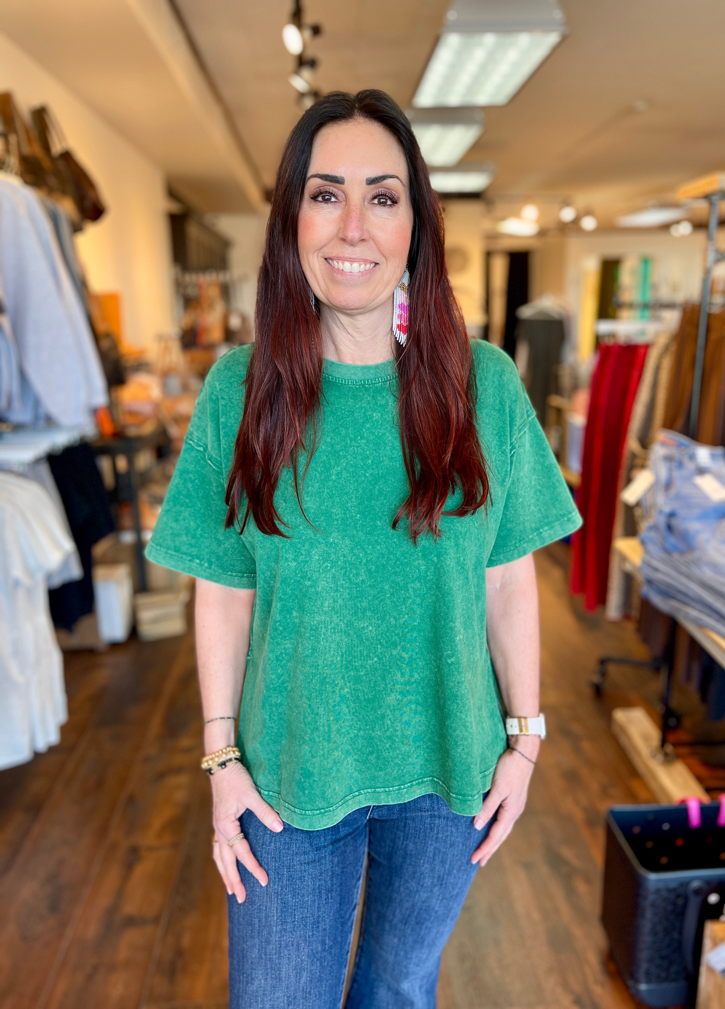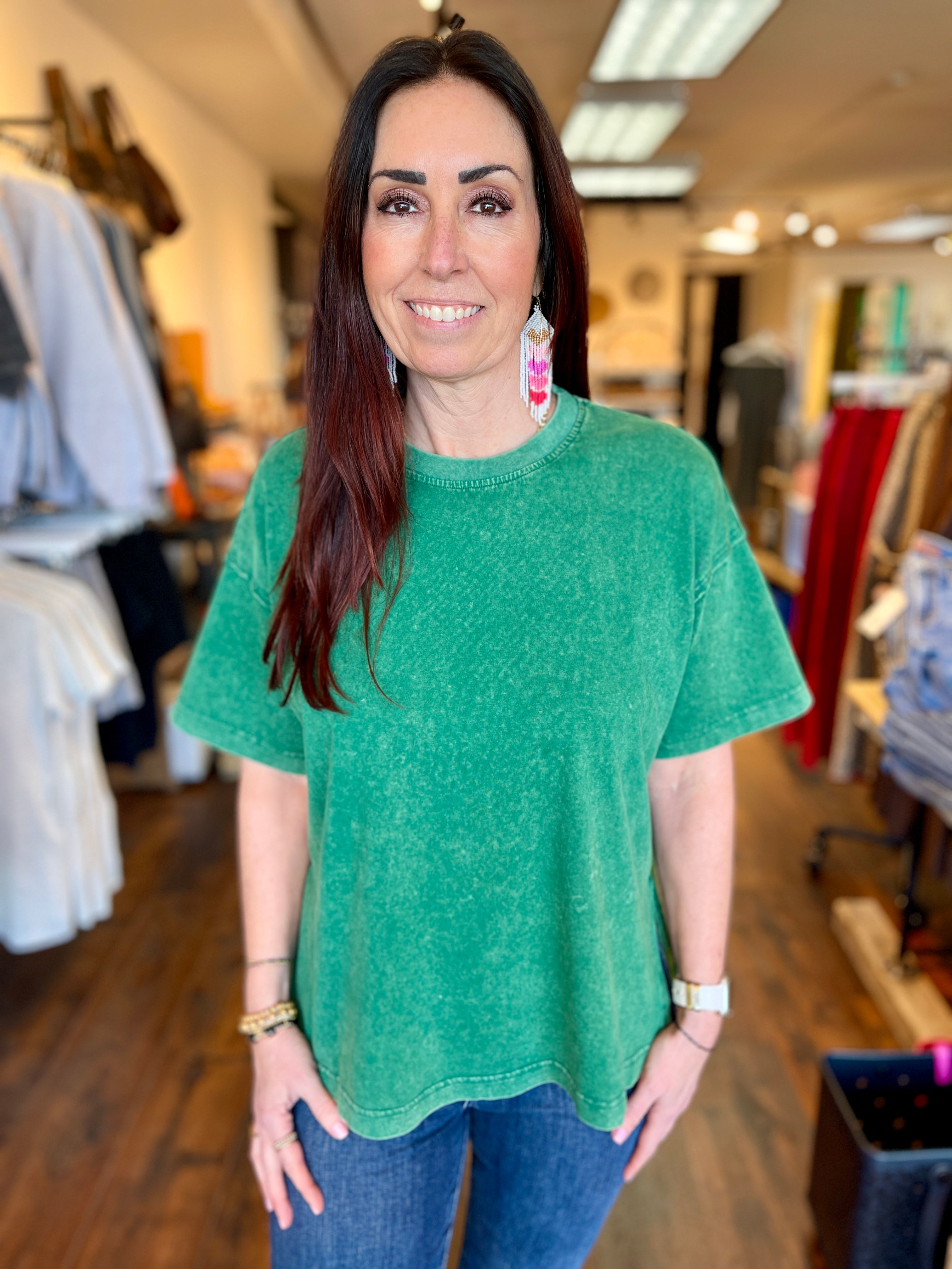 The Weekly Top because it'll be in your weekly rotation! Complete your look with this mineral-washed short sleeve tee. Designed with an oversized fit and chic slit details, it pairs effortlessly with any bottom for versatile styling.