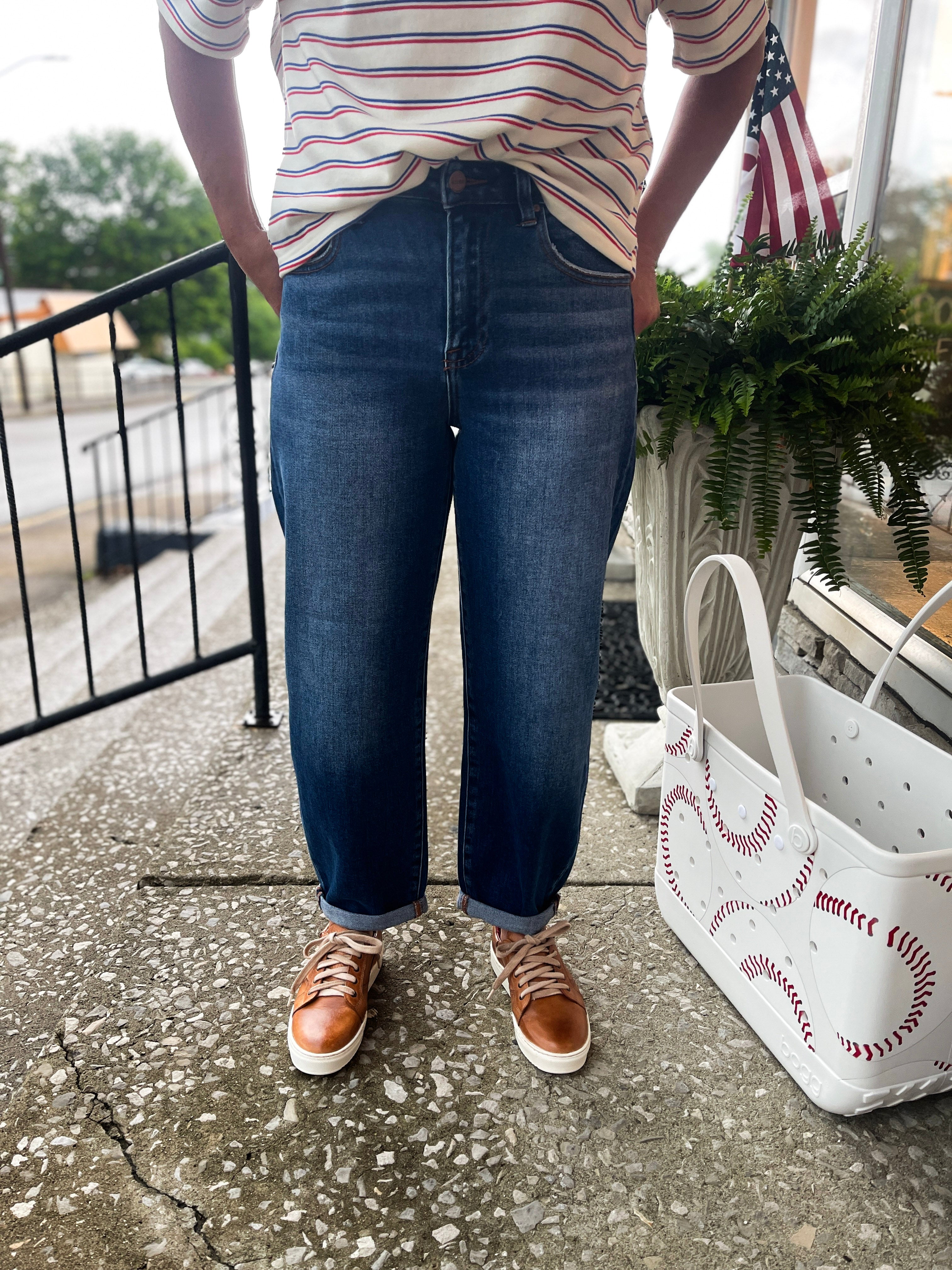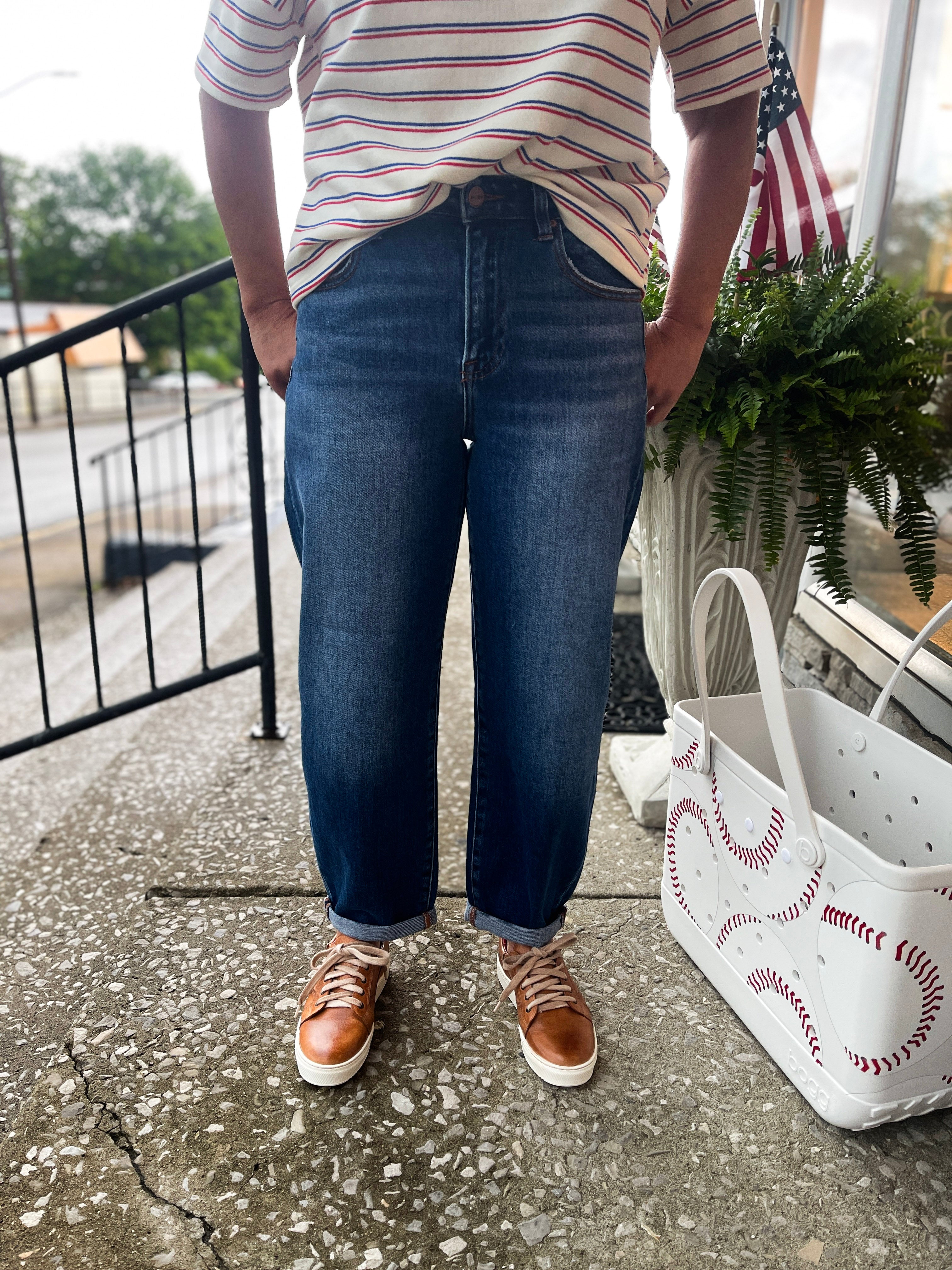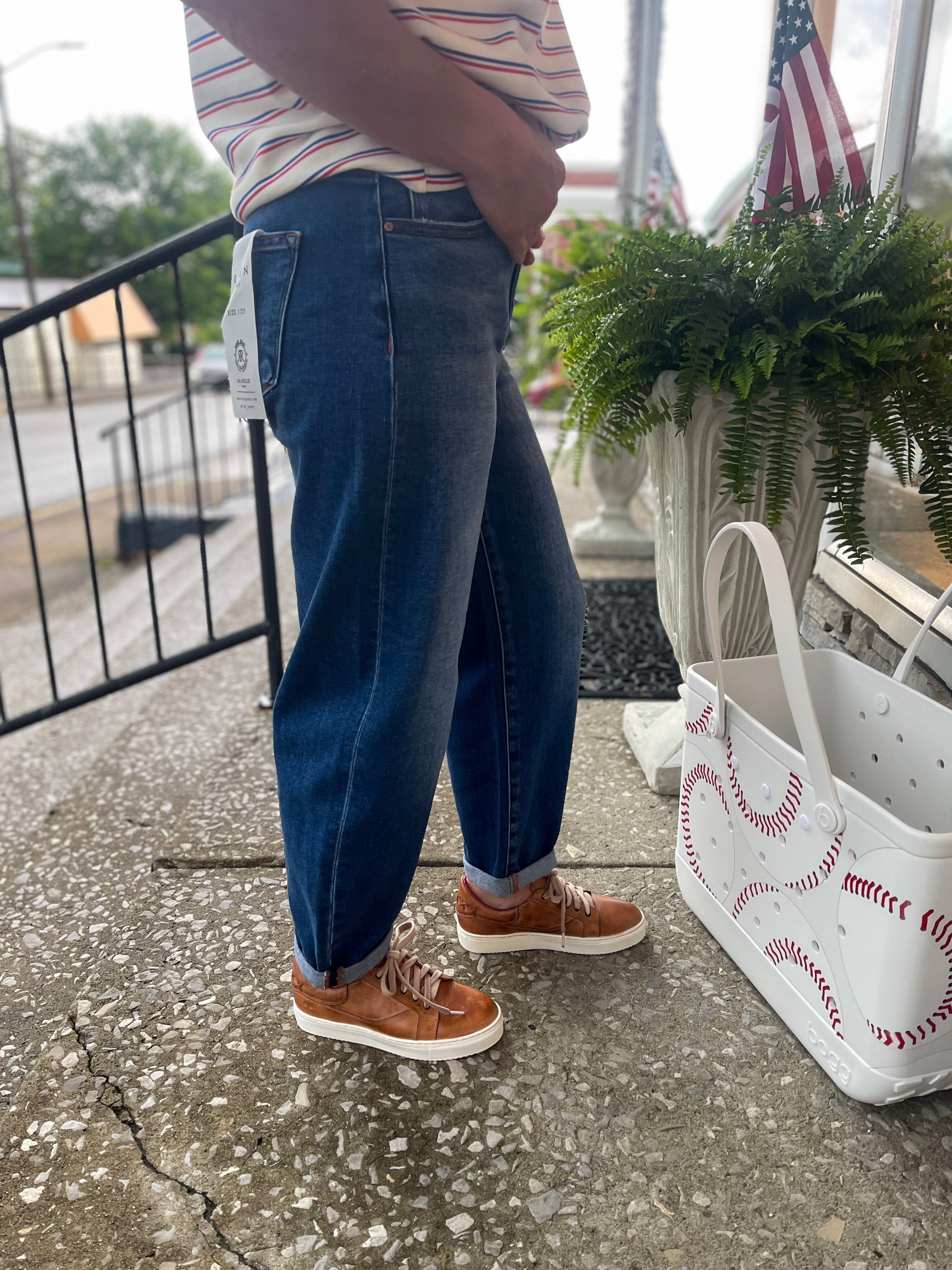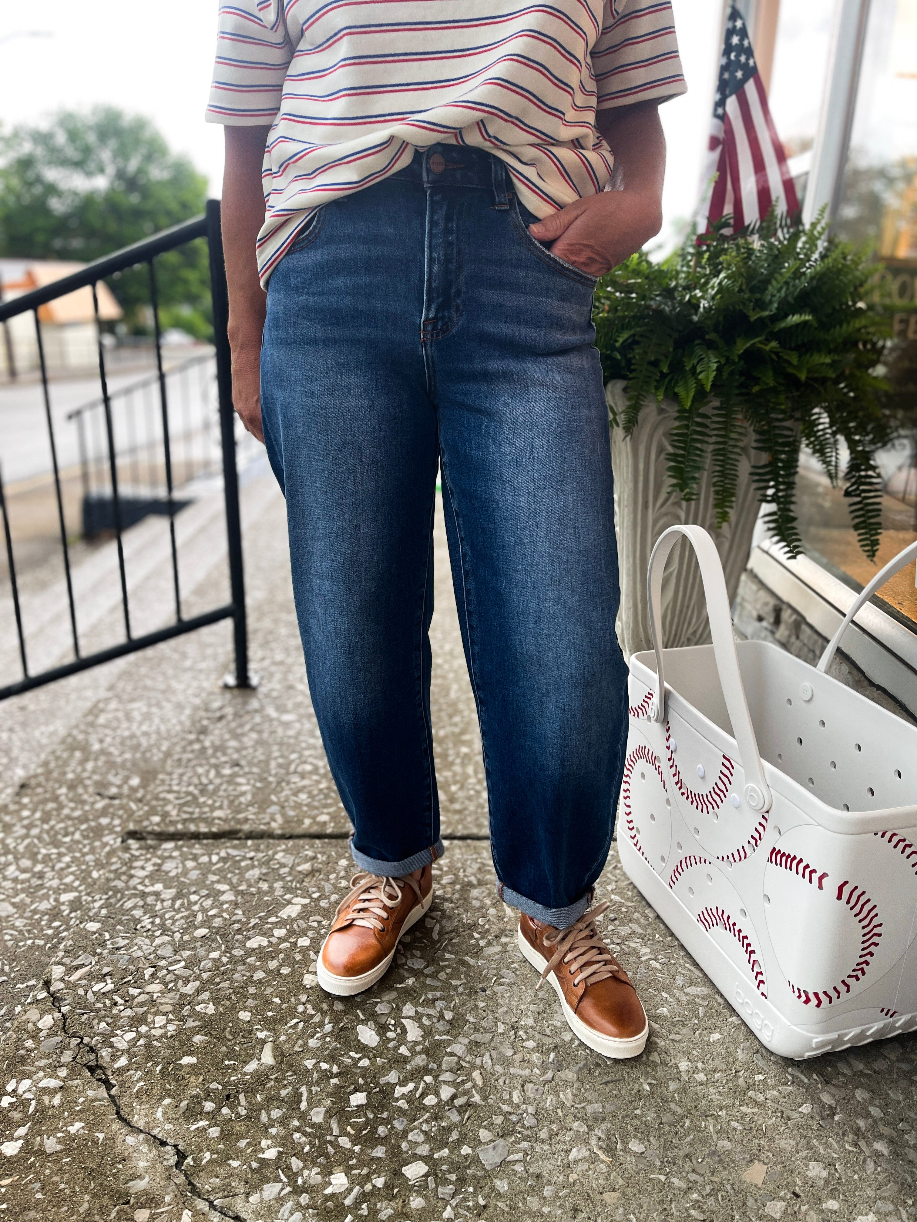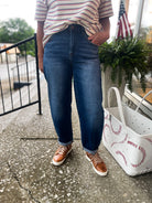 Alice Jeans combine a high-rise fit with a mild barrel leg for a flattering, trendy look. The cropped length and cuffed hems add a stylish edge, while the dark wash offers versatile wearability. Comfortable and chic, these jeans are perfect for elevating your everyday wardrobe with ease.