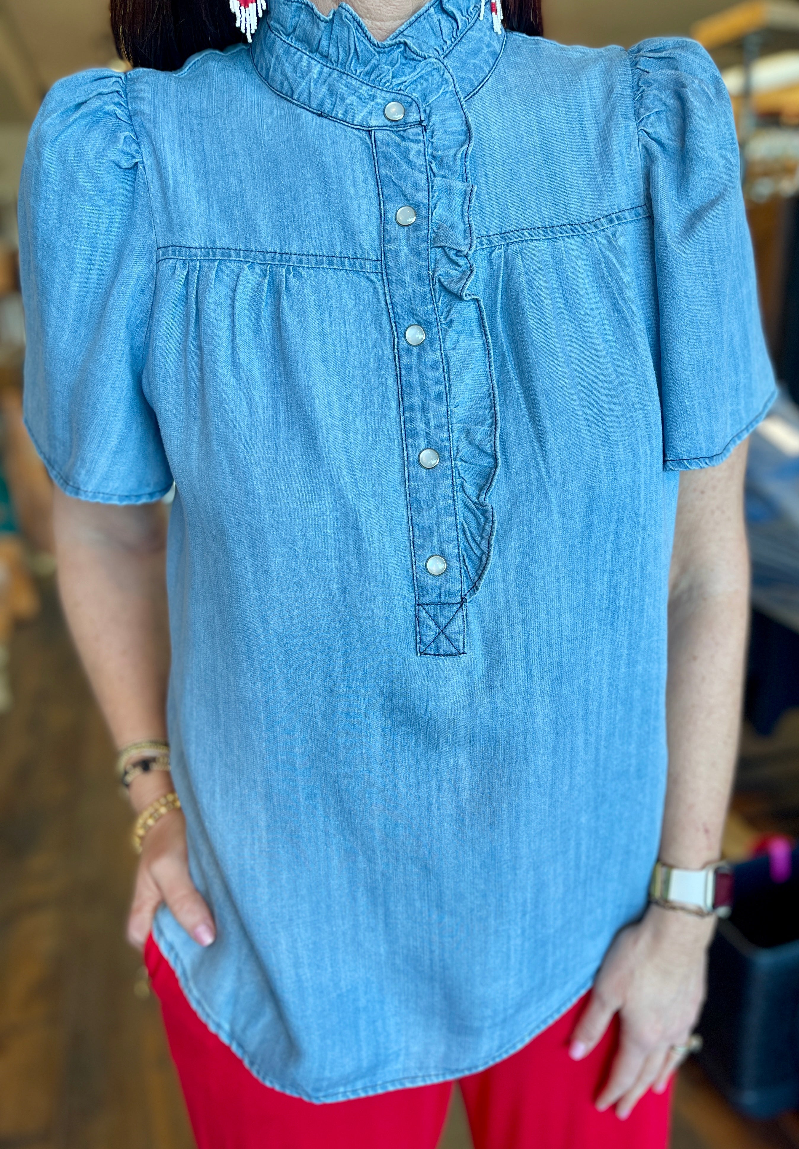 WASHED CHAMBRAY BUTTON DOWN WOVEN TOP