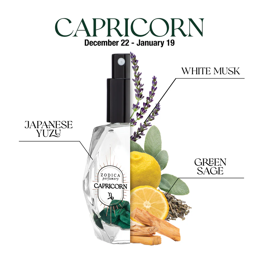 Capricorn (12/22 to 1/19) empowers with a grounding herbal bouquet. The cool citrus mirrors the iciness of this sign's winter season. Set a path to success with this earth sign's unwavering vibe. Crystal infused with Malachite, used through the ages to help breakthrough perceived limitations. Japanese Yuzu, Green Tea, Green Sage, Lavender, Clean Musk