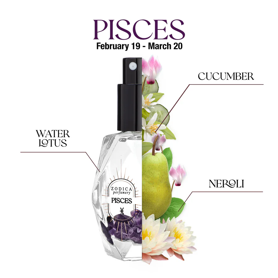 Pisces (2/19-3/20) embraces with peaceful fluidity. Fresh and clean like the ocean home of this water sign, its icy coolness reflects its winter season. Let go and float in its chill-out vibe. Crystal infused with Amethyst, used through the ages for its relaxing and soothing energy. Neroli, Cucumber, Pear, Cyclamen, Water Lotus, Sheer Musk