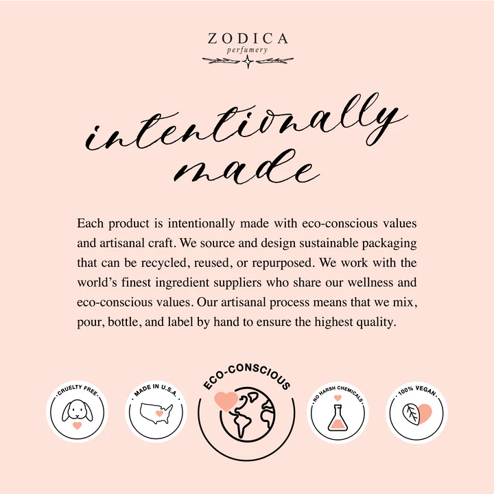 Taurus (4/20 to 5/20) beautifies as it reflects its Spring season with a lavish floral bouquet. A velvety undertone makes a sensual home for this earth sign. Makeover your day with its pretty vibe. Crystal infused with Indian Jade, used through the ages for its wealth and luck attracting energy. Iris, Lily of the Valley, Heliotrope, Geranium, White Amber, Sandalwood